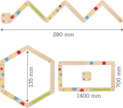 Dėl modulinės konstrukcijos elementus sujungsite į tiesias atkarpas, posūkius ar kryžmines jungtis ir lengvai pritaikysite sudėtingumą pagal vaiko amžių ir įgūdžius. Integruotos jungtys palengvina statybą ir laikymą, glotniai šlifuota mediena maloni liesti ir kviečia į saugų, judesiais pripildytą žaidimą.