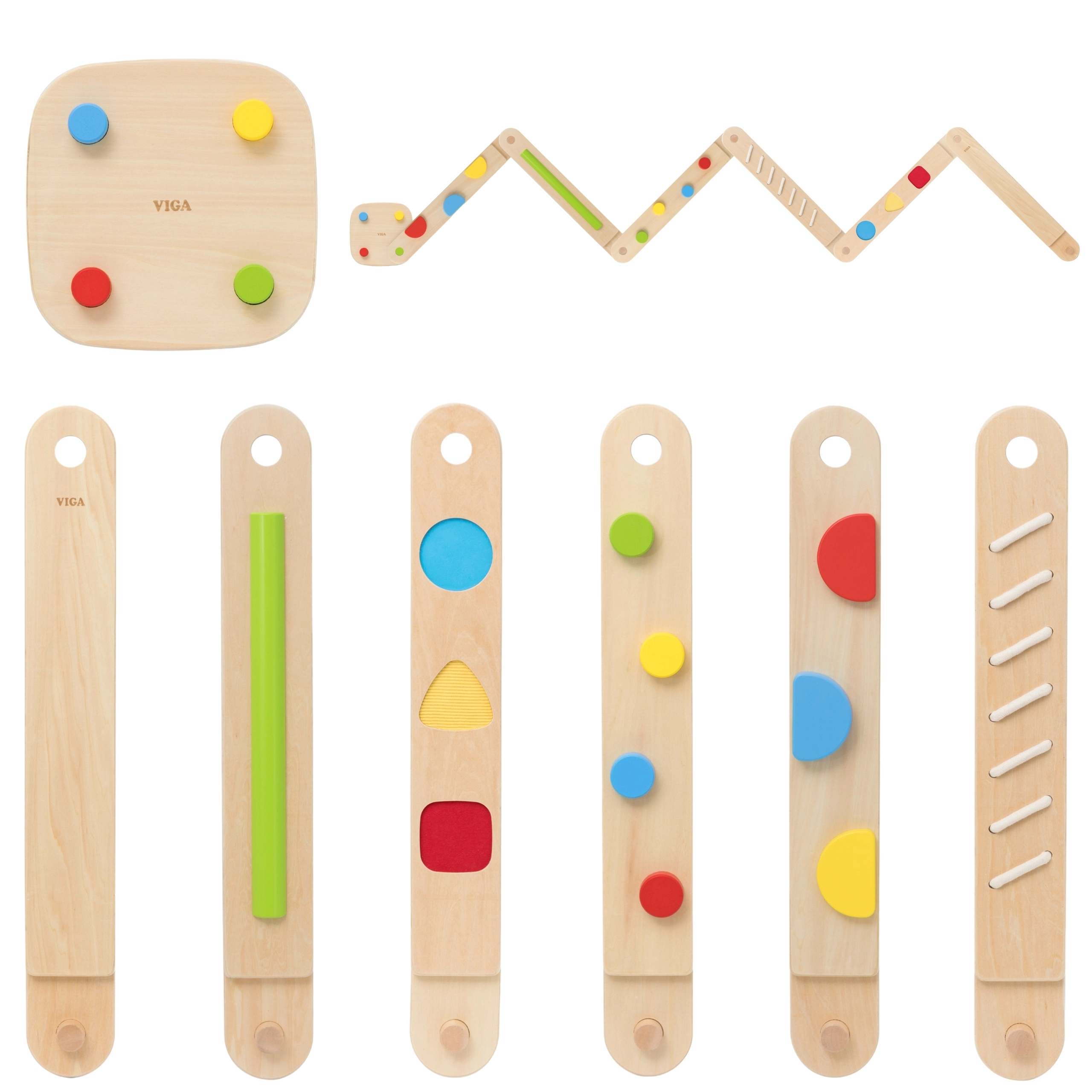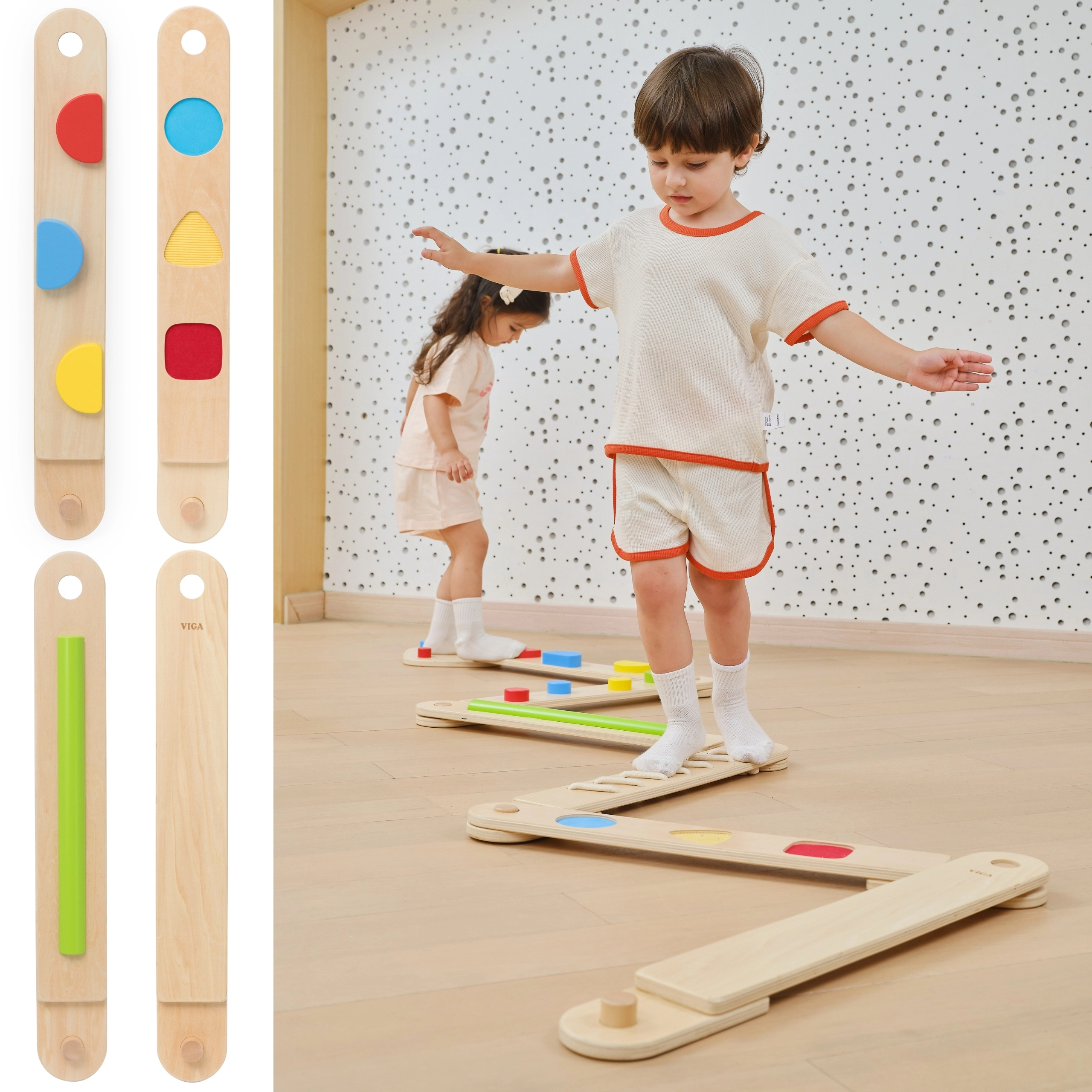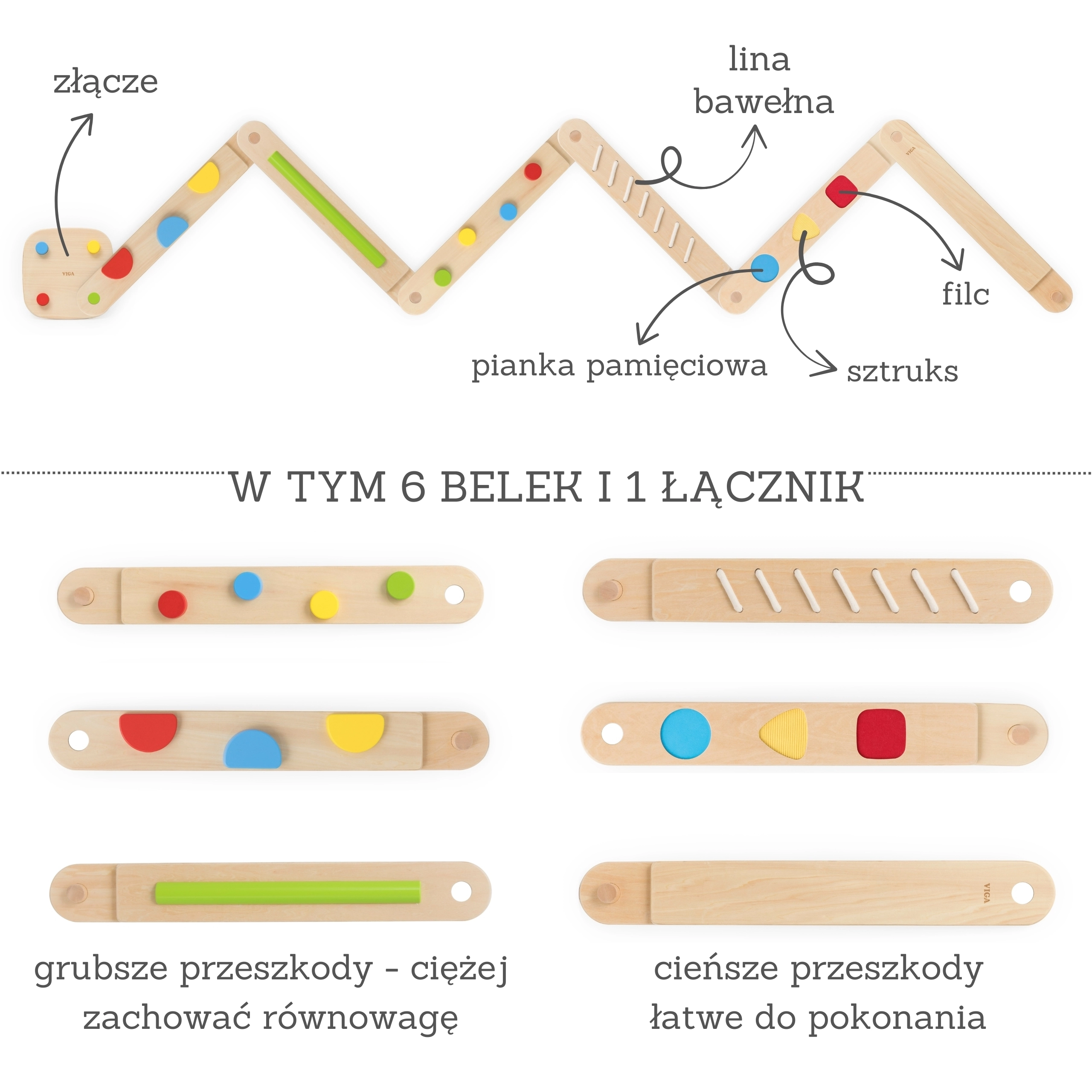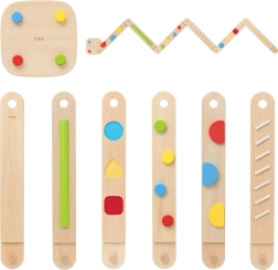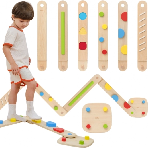 Atraskite žaismingą kelią jutimų ir pusiausvyros ugdymui su medine moduline trasa Viga. Rinkinyje yra 6 balansavimo lentos ir 1 jungtis su įvairiomis tekstūromis ir formomis, skirtomis koordinacijai, stambiajai motorikai ir vaikų pasitikėjimui savimi lavinti. Detales galima laisvai derinti, tad lengvai sukursite naujus maršrutus – nuo paprastesnių iki sudėtingesnių – saugiai ir su judėjimo džiaugsmu.