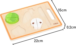- Medinė pjaustymo lenta, medinis peiliukas, 4 rūšių daržovės (kopūstas, morka, svogūnas, pievagrybis)
