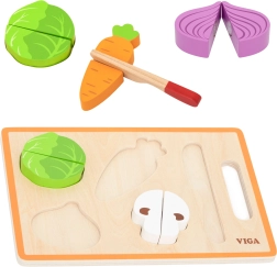 Atraskite smagų montessori žaislą iš VIGA: medinį daržovių pjaustymo rinkinį su pjaustymo lentele ir peiliuku. Dėl lipukų sujungimų „pjaustant“ skleidžiamas realistiškas garsas, lavinama smulkioji motorika, akių–rankų koordinacija ir kūrybiškas virėjo vaidmenų žaidimas. Puikus papildymas vaikų virtuvėlei ir bendrai šeimos veiklai.