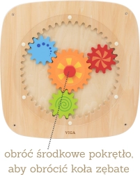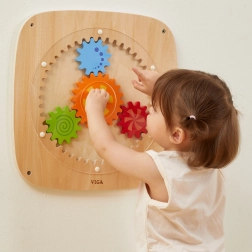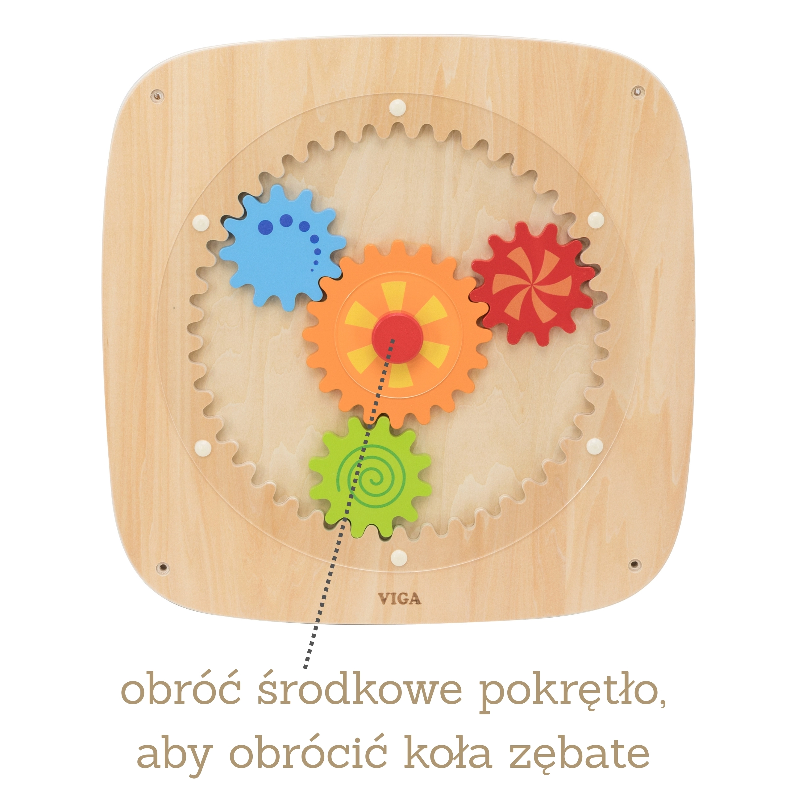 Ši medinė sieninė lenta su spalvotais krumpliaračiais sukurta taip, kad vaikams teiktų atradimo džiaugsmą. Pasukus centrinį ratuką, visi krumpliaračiai pradeda suktis iškart, natūraliai parodant jėgos, judėjimo ir priežastinių ryšių principus. Skirtingos spalvos ir raštai ant ratukų sukantis kuria patrauklius vizualinius efektus.