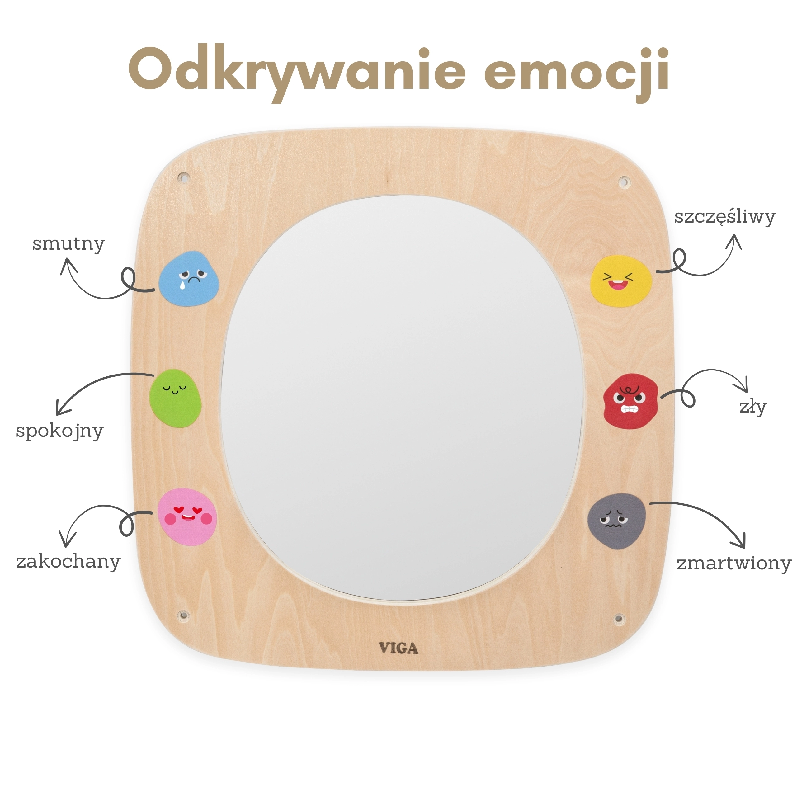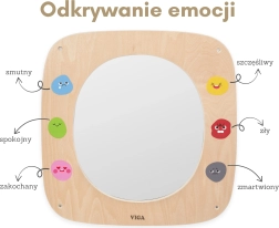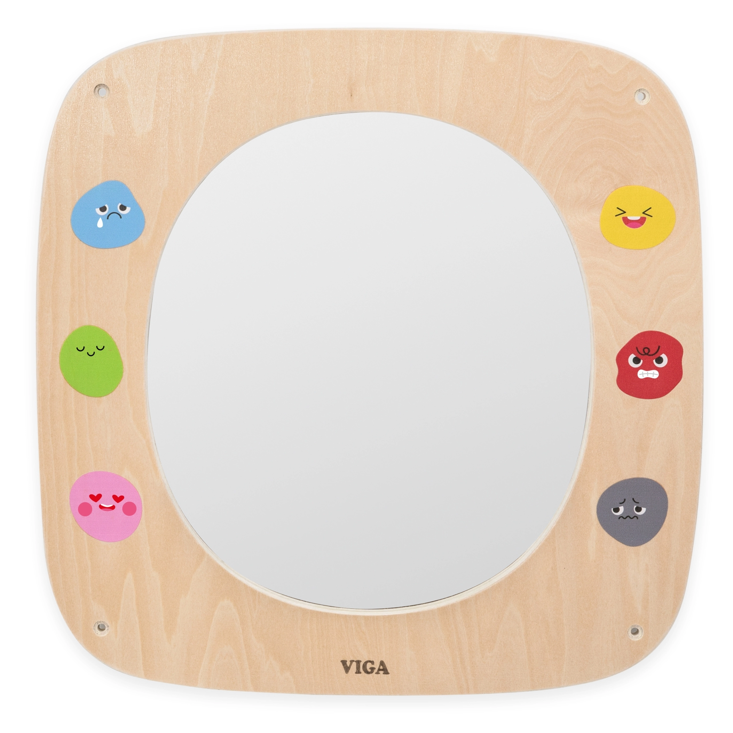 VIGA medinė veidrodinė lenta idealiai tinka vaikų kambariui, darželiams ir žaidimų kampeliams. Didelis saugus veidrodis su aiškiu rėmu padeda vaikams pažinti savo veido išraiškas, mėgdžioti mimiką ir mokytis skirti emocijas. Spalvingi emotikonai aplink rėmą įkvepia kalbėti apie jausmus ir natūraliai ugdo emocijų intelektą.