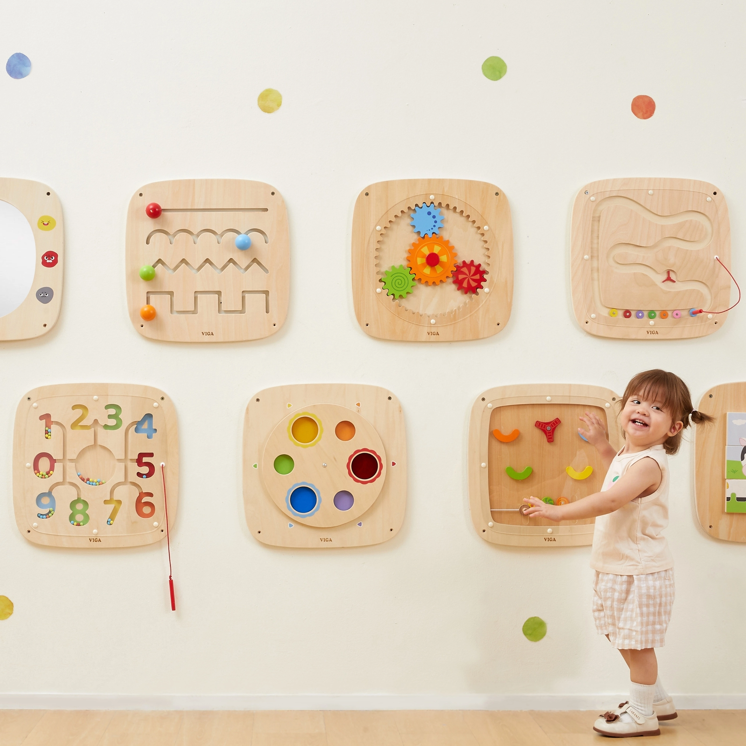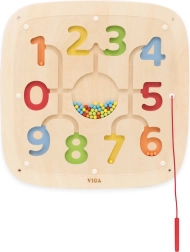 Ši medinė sieninė lenta su skaičiais 0–9 sujungia pramogą ir mokymąsi viename. Vaikai, naudodami pridėtą magnetinį stylusą, veda spalvotus kamuoliukus pažymėtais takeliais, priskiria juos skaičiams ir taip lavina skaičiavimą bei akių–rankų koordinaciją.