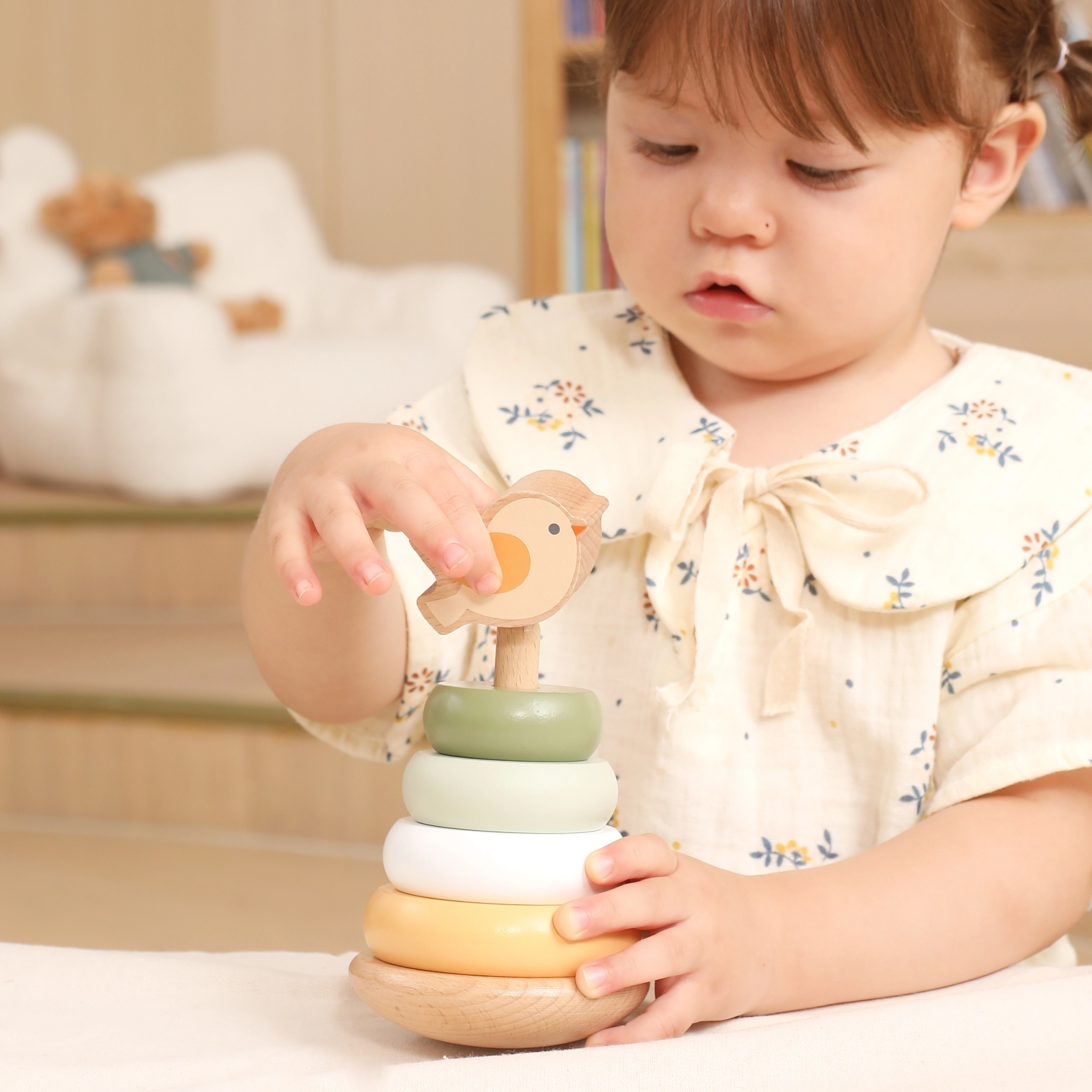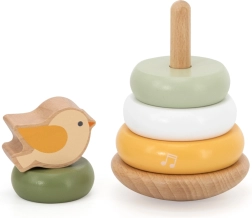 Medinė dėliojama bokštelė su mielu paukšteliu viršuje pradžiugins kiekvieną mažylį. Spalvoti žiedai su lygiomis briaunomis lengvai sugriebiami ir dėliojami įvairia seka, o tai skatina spalvų ir dydžių skyrimą bei problemų sprendimą. Stabili bazė ir maloniai suapvalintos formos užtikrina saugų naudojimą mažoms rankoms.