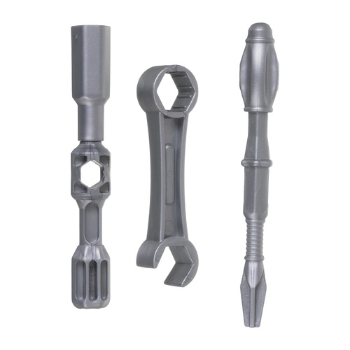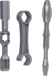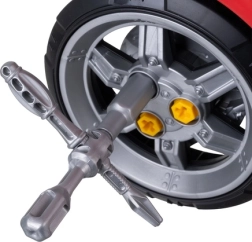 Įtraukti saugūs plastikiniai įrankiai – atsuktuvas, raktai ir antgaliai. Idealu griebimo, koordinacijos ir savarankiškumo treniravimui montuojant ir išmontuojant.