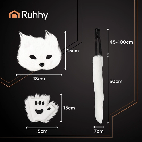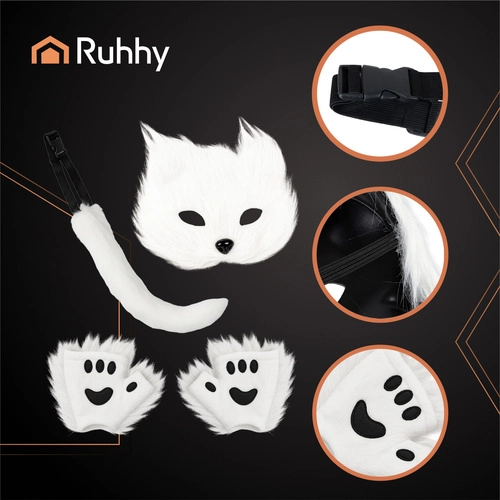 Išreikškite savo asmenybę su universaliu RUHHY 4 viename kostiumu. Rinkinyje yra kaukė su gumele, reguliuojama uodega su formuojamu laidu ir mielos letenėlės/pirštinės. Dėl minkšto ir malonaus kailiuko, universalios dydžio sistemos ir lengvos konstrukcijos tai idealus pasirinkimas cosplay, konvencijoms, fotosesijoms, vakarėliams ir Helovinui. Akimirksniu tapkite paslaptinga kate, žavia lape arba laukiniu vilku – tereikia apsirengti ir suspindėti.
