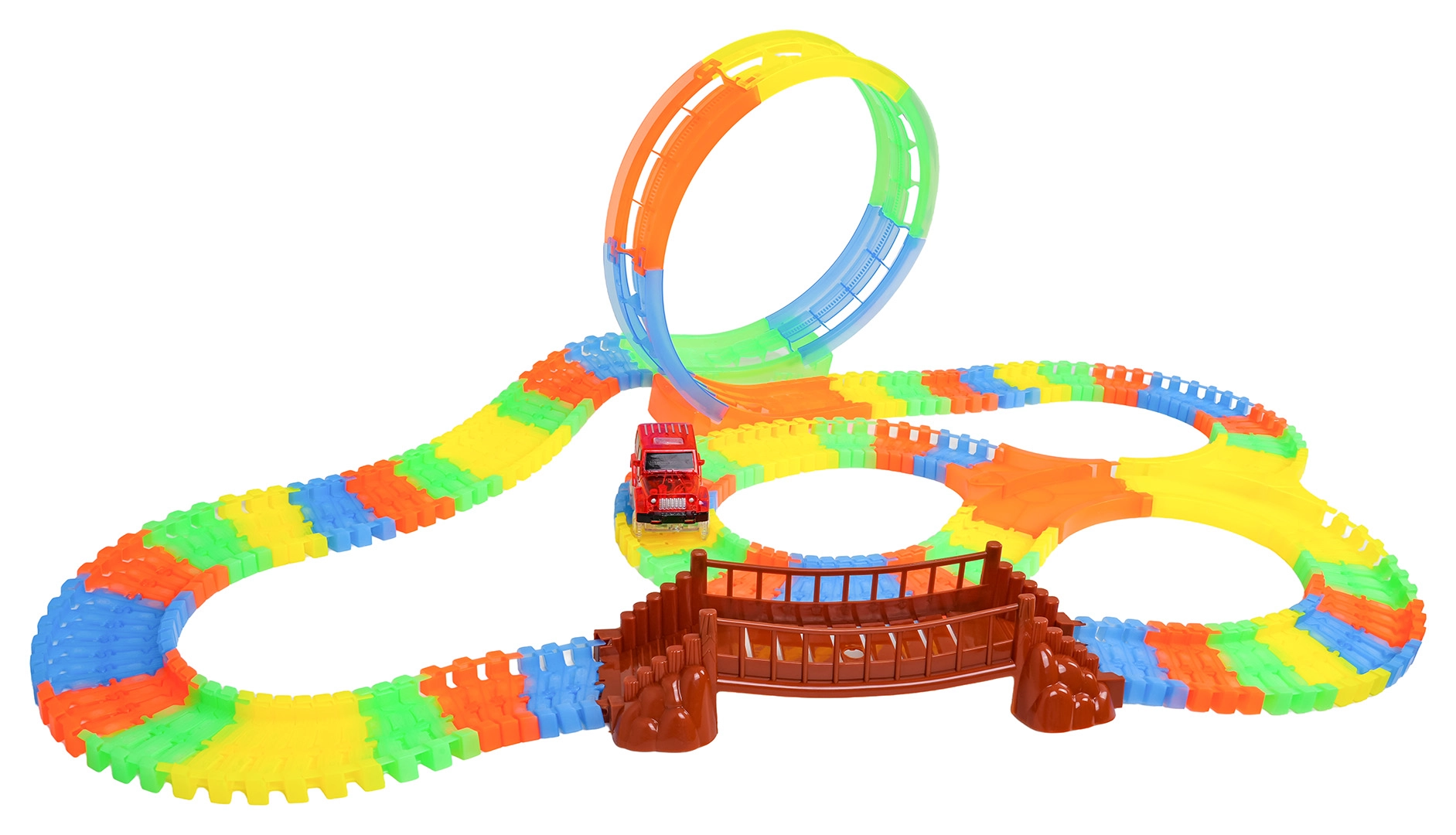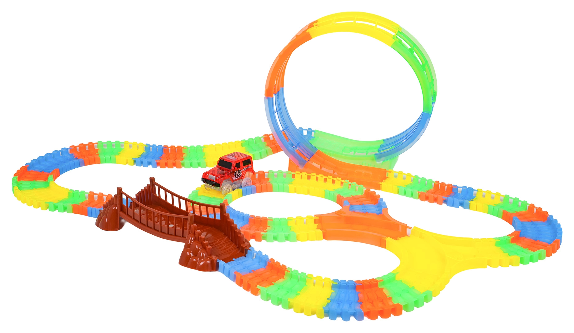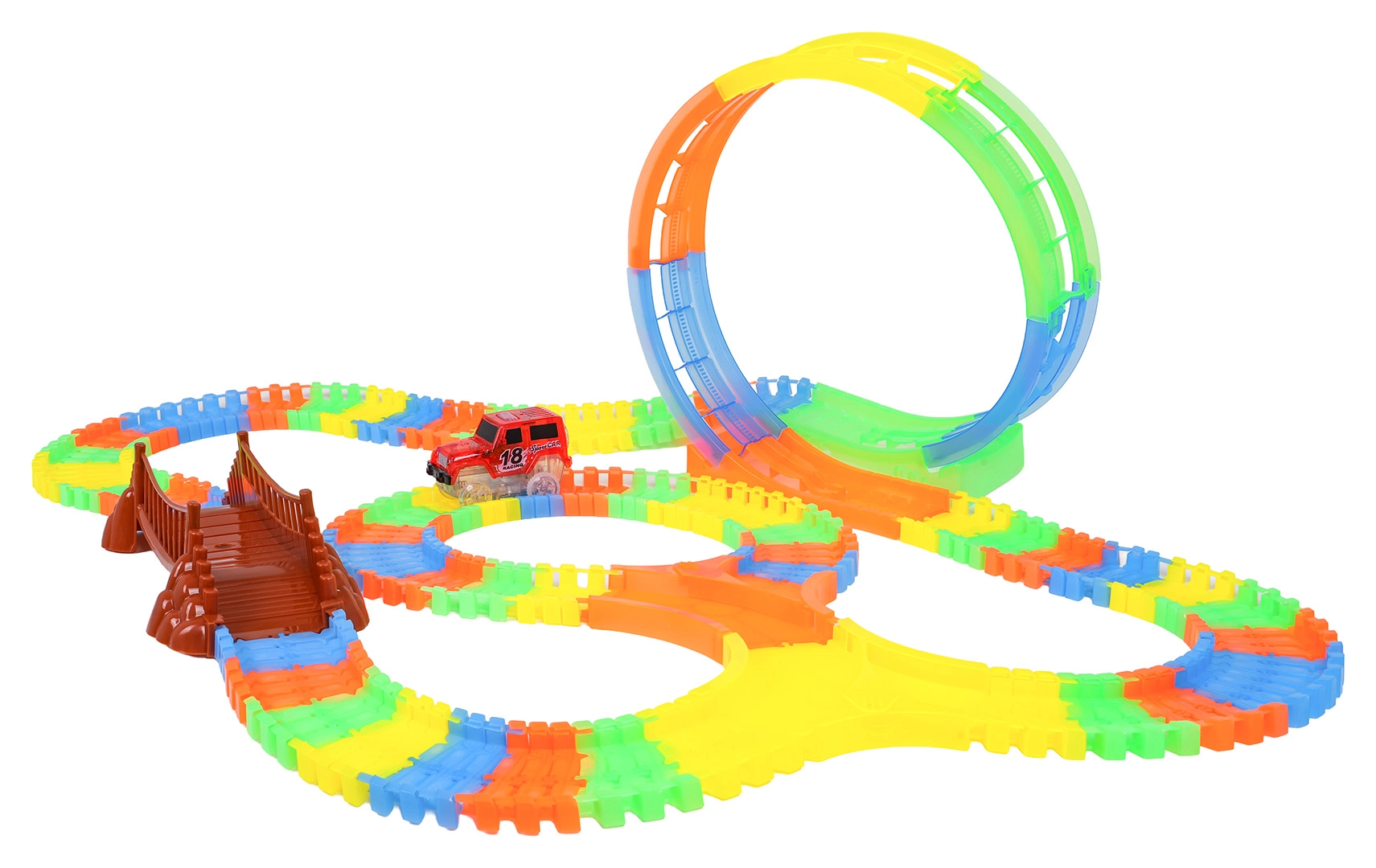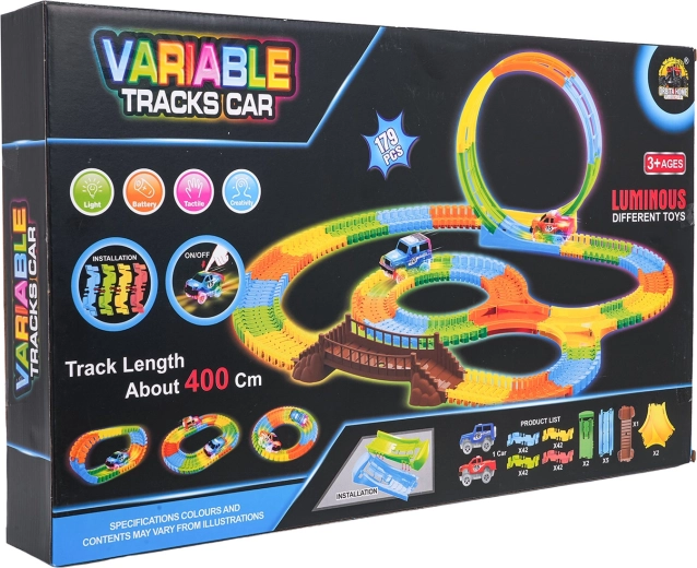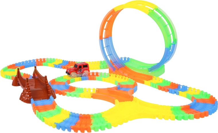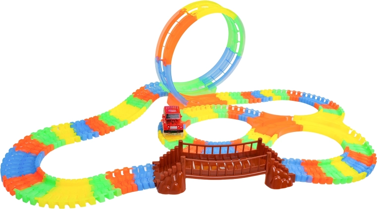 Ši spalvinga trasa pradžiugins vaikus nuo 3 metų. Dėl lanksčių segmentų per akimirką pastatysite tiesiąsias, posūkius, tiltą ir didelę vertikalią kilpą. Fluorescencinė apdaila užtikrina švytėjimo tamsoje efektą, o LED automobilėlis važiuodamas palieka šviesos pėdsaką.