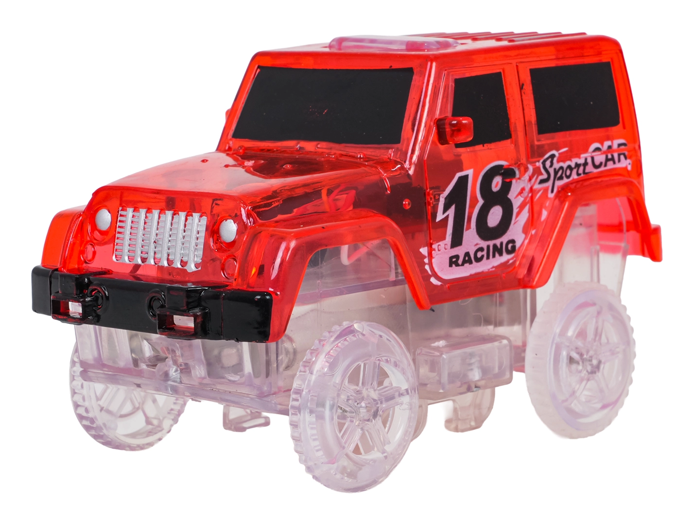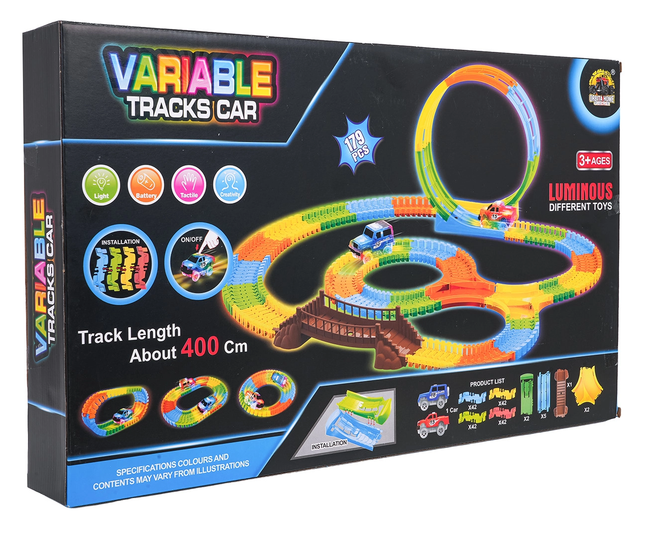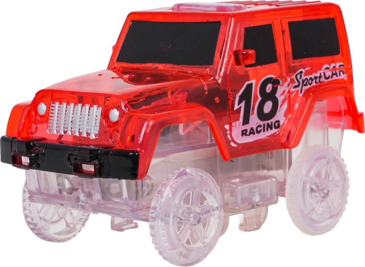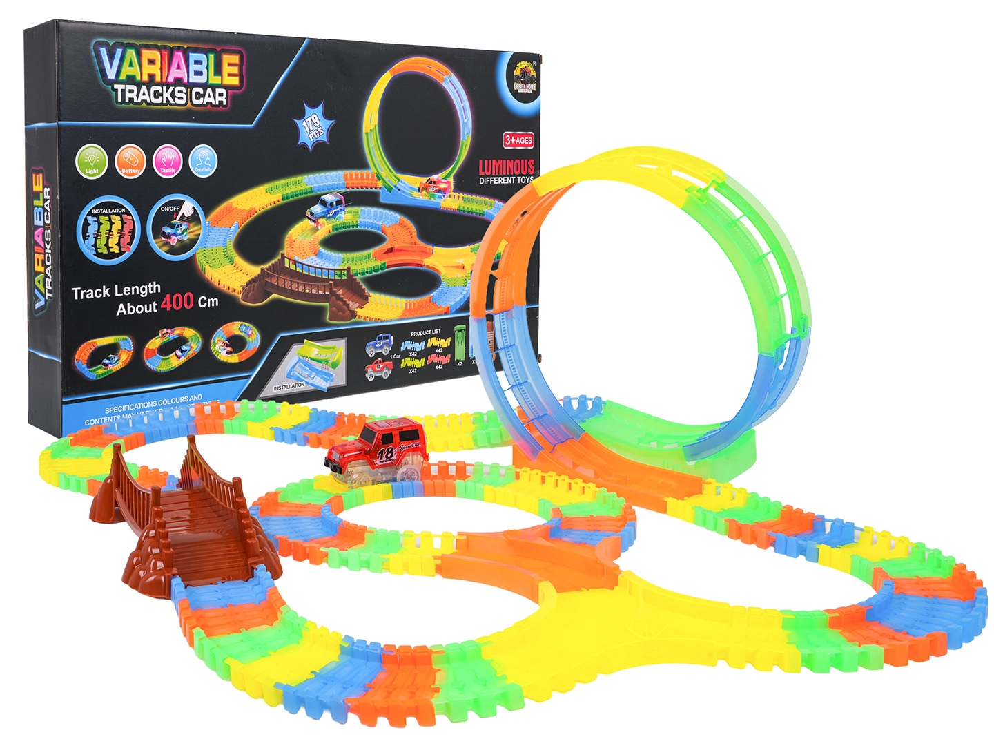 Ši spalvinga trasa pradžiugins vaikus nuo 3 metų. Dėl lanksčių segmentų per akimirką pastatysite tiesiąsias, posūkius, tiltą ir didelę vertikalią kilpą. Fluorescencinė apdaila užtikrina švytėjimo tamsoje efektą, o LED automobilėlis važiuodamas palieka šviesos pėdsaką.