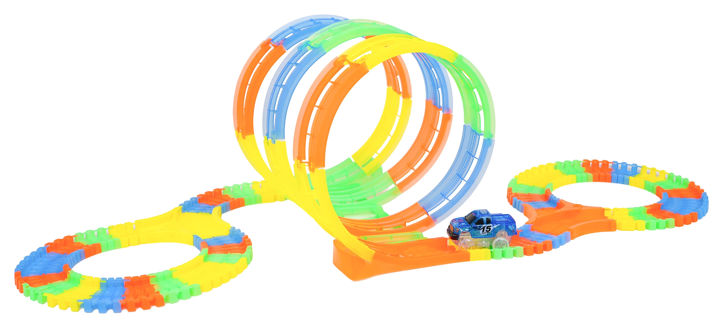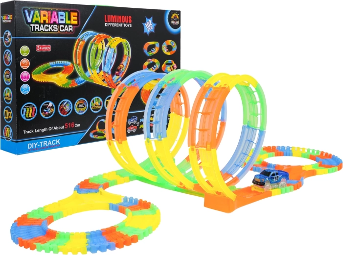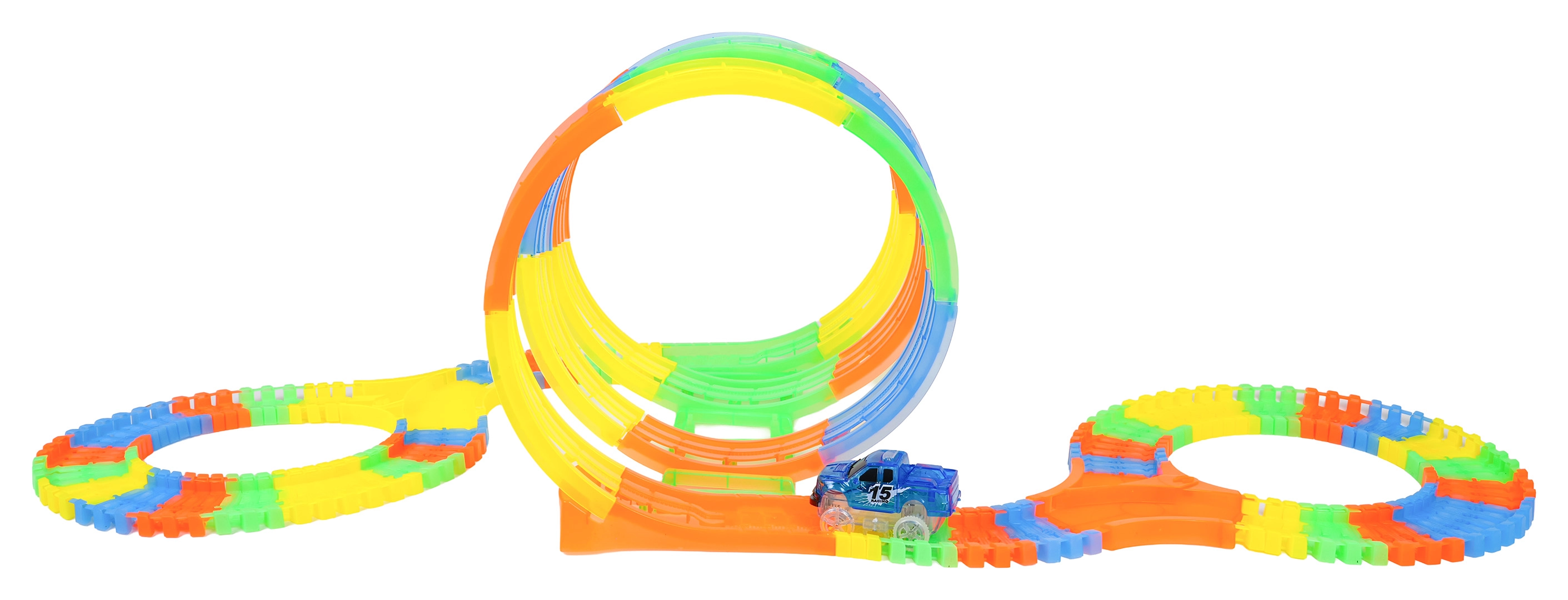 Ši spalvinga trasa siūlo vaikams kūrybišką konstravimą ir dinamišką važiavimą. Dėl elastingų, susisegamų dalių akimirksniu atsiranda kilpos, posūkiai ir tiltai, kuriuos galima bet kada perstatyti – net ir važiuojant. Fluorescencinė trasos danga ir LED apšvietimas automobiliuke tamsoje sukuria puikų šviesos šou.