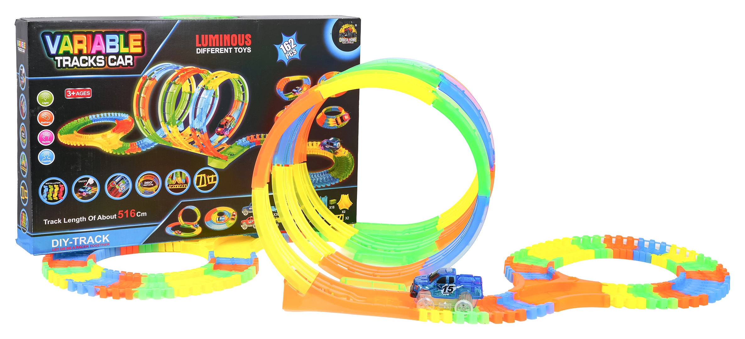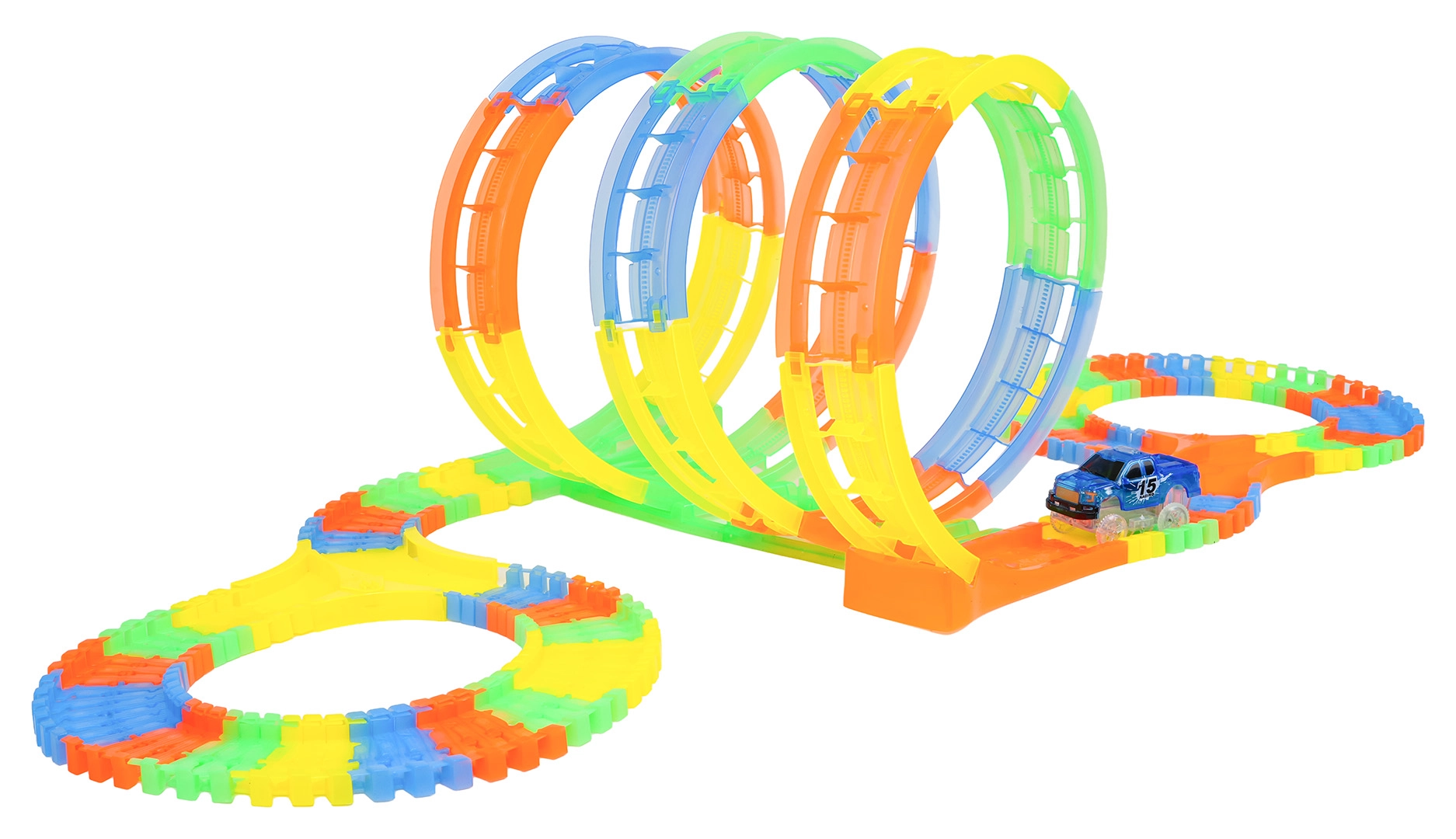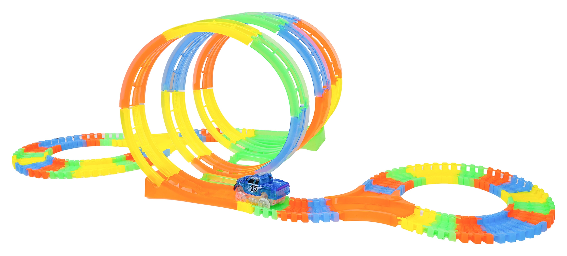 Ši spalvinga trasa siūlo vaikams kūrybišką konstravimą ir dinamišką važiavimą. Dėl elastingų, susisegamų dalių akimirksniu atsiranda kilpos, posūkiai ir tiltai, kuriuos galima bet kada perstatyti – net ir važiuojant. Fluorescencinė trasos danga ir LED apšvietimas automobiliuke tamsoje sukuria puikų šviesos šou.