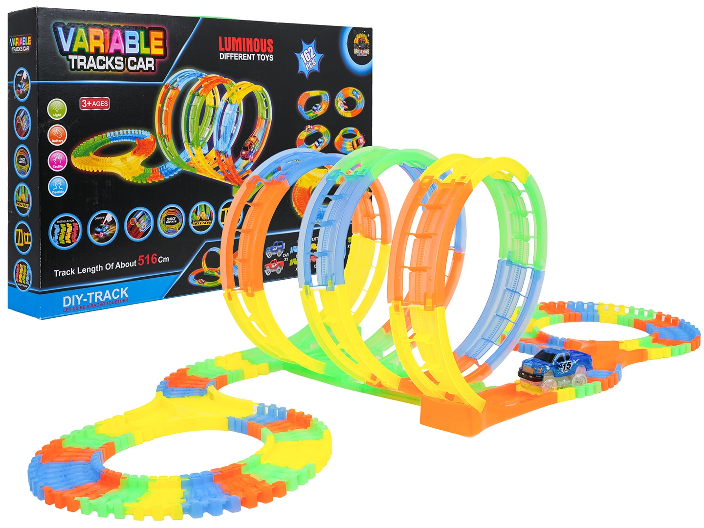 Suteikite vaikams begalę pramogų su lenktynine trasa, turinčia 162 dalis, kuri yra lanksti, šviečia tamsoje ir komplektuojama su LED automobiliuku. Detales galima lengvai susegti į įvairias formas ir kilpas, todėl mažieji lenktynininkai nuo 3 metų gali kurti savo trasas ir mėgautis kaskadiniais važiavimais su įspūdingu šviesos efektu.