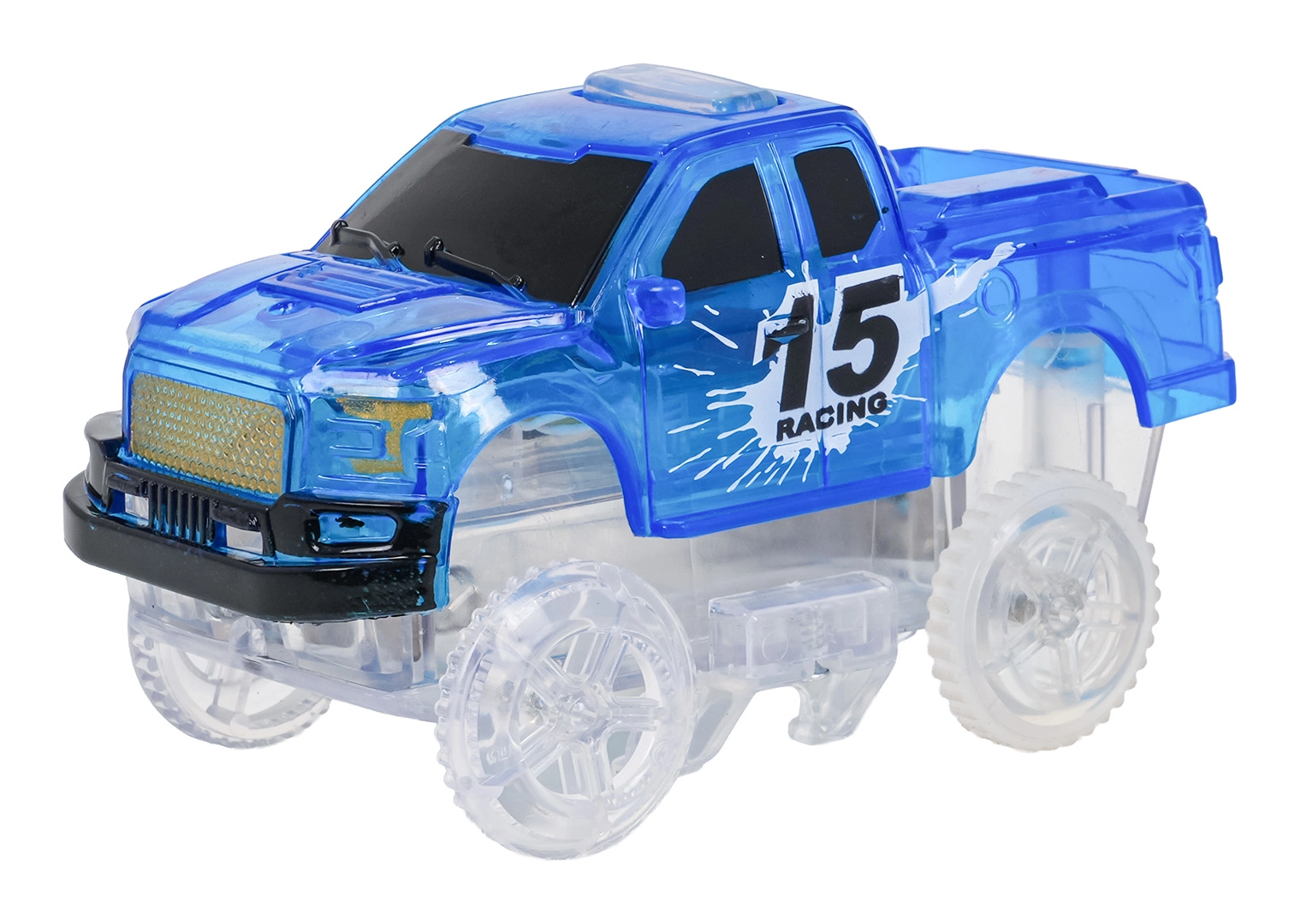 Skaidrus lenktyninis automobilis su LED diodais atgaivina trasą. Tereikia paspausti mygtuką ant stogo. Maitinimas 2× AA (nepridedama).