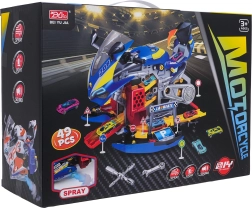 - 2‑in‑1: motociklas ir dirbtuvės – atverkite šonus ir pradėkite „servisą“