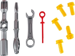 Rinkinyje yra gausus dalių ir įrankių komplektas: 31 varžtas ir medsraigčiai, daliamas raktas ir atsuktuvas, plokščias/žiedinis raktas, ratai su ratlankiais, vairas, kapotas su varikliu ir lipdukai personalizavimui. Vaikai treniruoja smulkiąją motoriką, kantrybę ir loginį mąstymą – ir tuo pačiu puikiai leidžia laiką.
