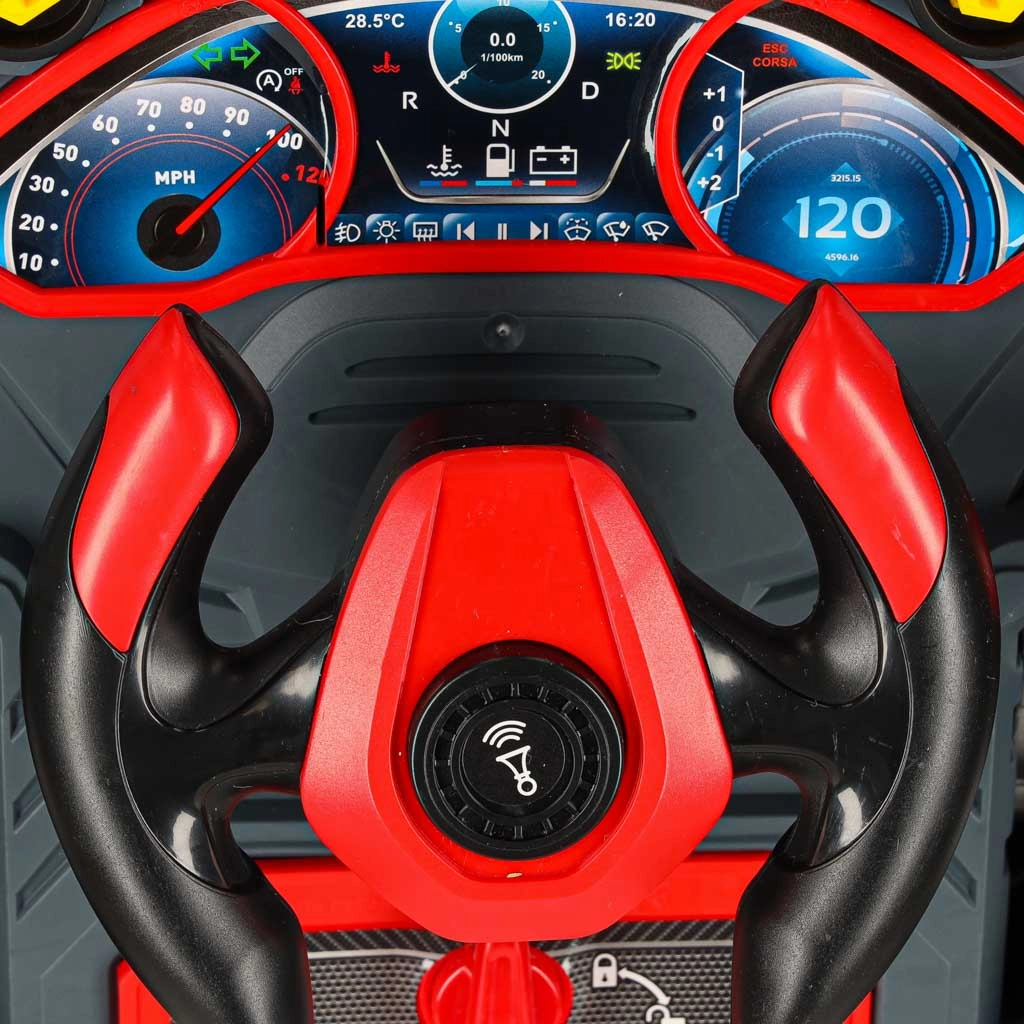 Variklio ir garso signalo (pyptelėjimo) garsai, mirksinčios šviesos, starto mygtukas ir avarinė šviesa pavers vaikų kambarį tikra autoserviso erdve.
