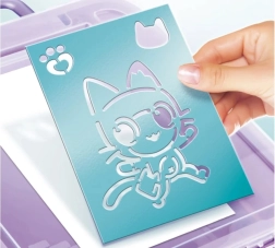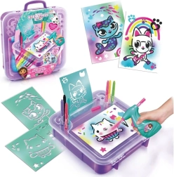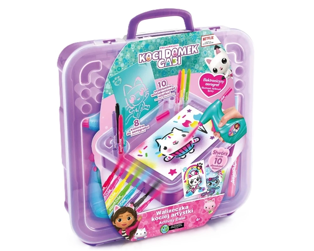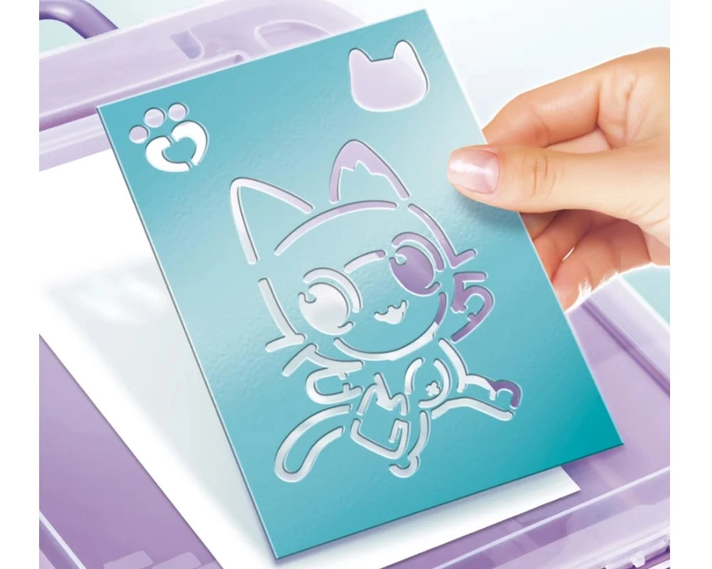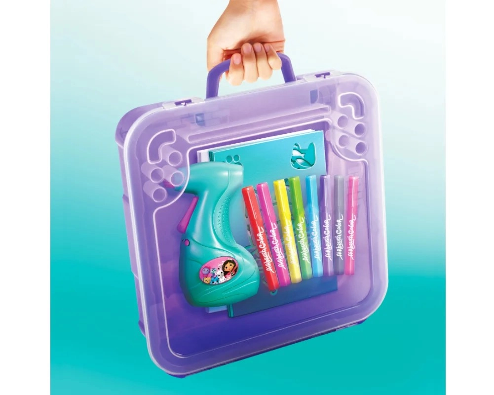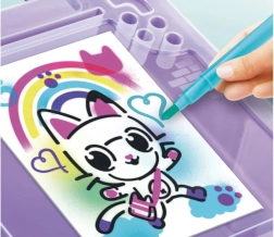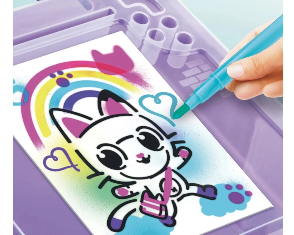 Šis nešiojamas kūrybinis rinkinys yra puiki dovana mažiesiems menininkams, mėgstantiems spalvas ir fantaziją. Tereikia įstatyti flomasterį į prietaisą, paspausti mygtuką ir pradėti purkšti – paprastą valdymą lengvai įveiks net mažesni vaikai. Dizainas, įkvėptas pasakos Gabi kačiukų namelis, pradžiugins visus mielų kačiukų personažų gerbėjus.