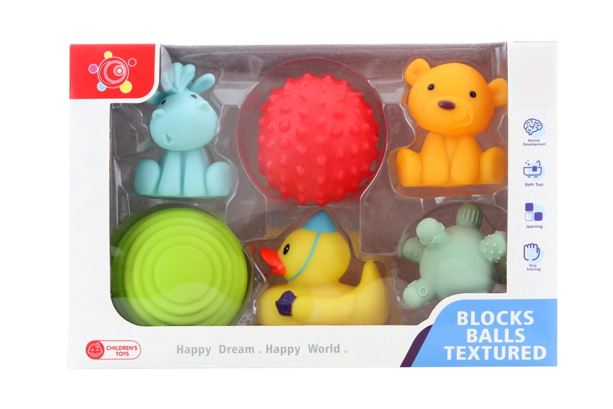 - 6 guminiai žaislai (3 formų + 3 su gyvūnų motyvais)