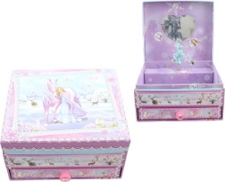 Žavinga muzikinė papuošalų dėžutė su vienaragio motyvu pradžiugins kiekvieną smulkių lobelių mylėtoją. Užsukus raktelį ir atidarius dangtelį, figūrėlė ima suktis, o skamba maloni melodija. Viduje rasite veidrodėlį, patogų matuojantis papuošalus, o apačioje ištraukiamą stalčiuką žiedeliams, apyrankėms ir kitoms smulkmenoms. Kompaktiški apie 16 × 14 × 9 cm matmenys ir subtilūs pasakiški motyvai paverčia šią dėžutę gražiu vaikų kambario akcentu ir puikia dovanų idėja.