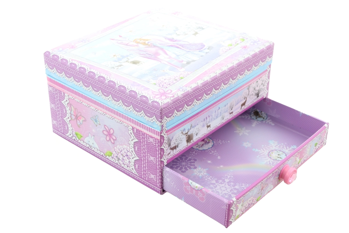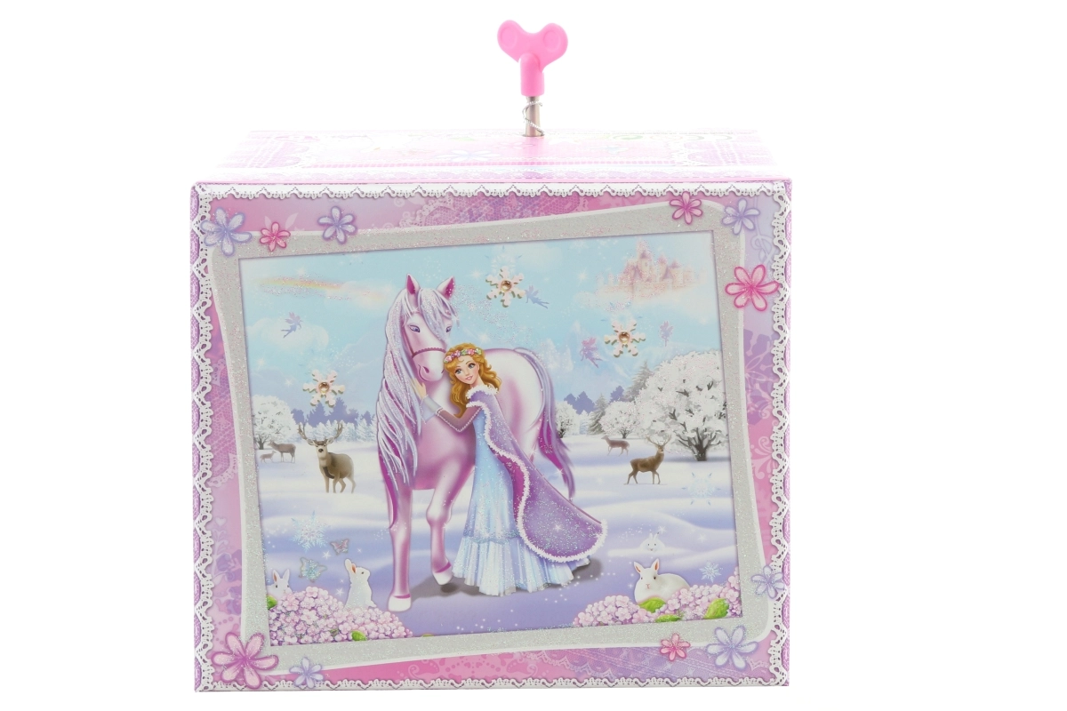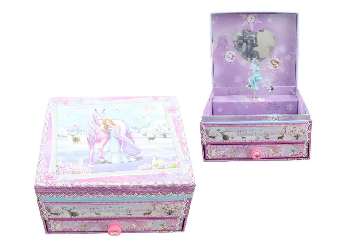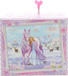 Ši elegantiška muzikinė papuošalų dėžutė su žiemos princesės ir vienaragio motyvu derina dekoratyvią išvaizdą ir praktišką išdėstymą. Užsukus mechaninį laikrodinį mechanizmą ir atidarius dangtelį, figūrėlė ima suktis ir suskamba melodija, sukurianti magišką atmosferą.