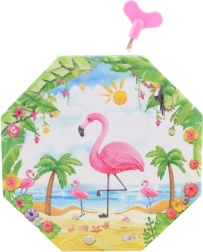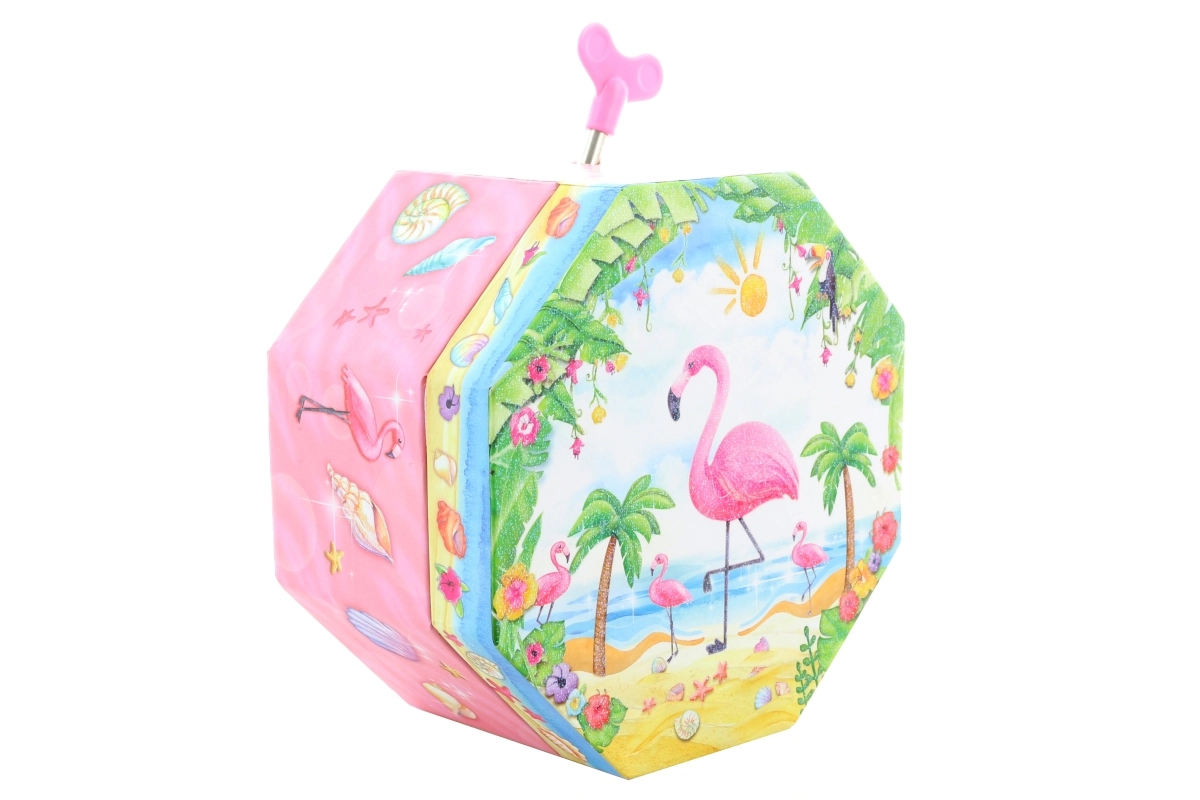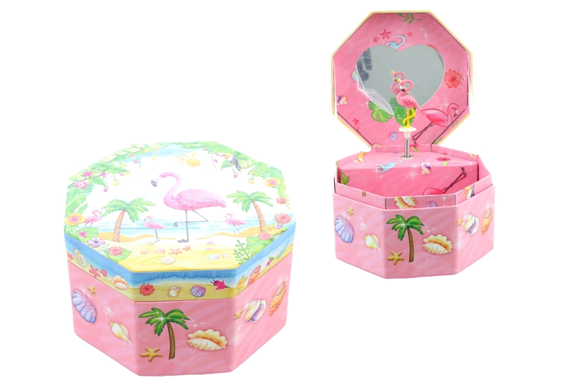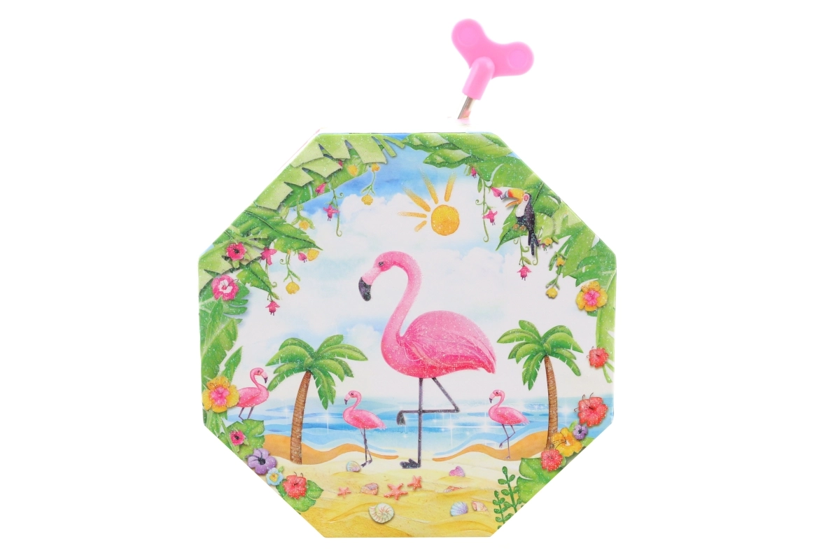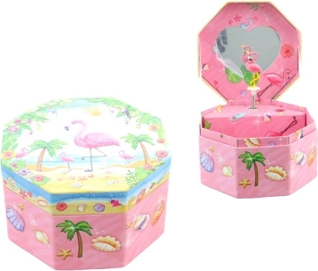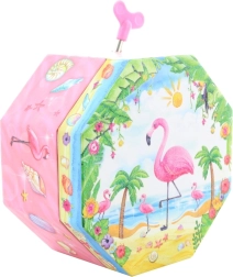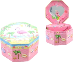 Ši žavinga rožinė muzikinė papuošalų dėžutė išsiskiria aštuonkampe forma ir tropiniu motyvu su flamingu, palmėmis ir kriauklėmis. Atidarius pasirodo šokantis flamingas prieš širdelės formos veidrodėlį, kuris ima suktis atsukus raktelį ir palydi papuošalų dėliojimą malonia melodija.