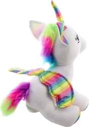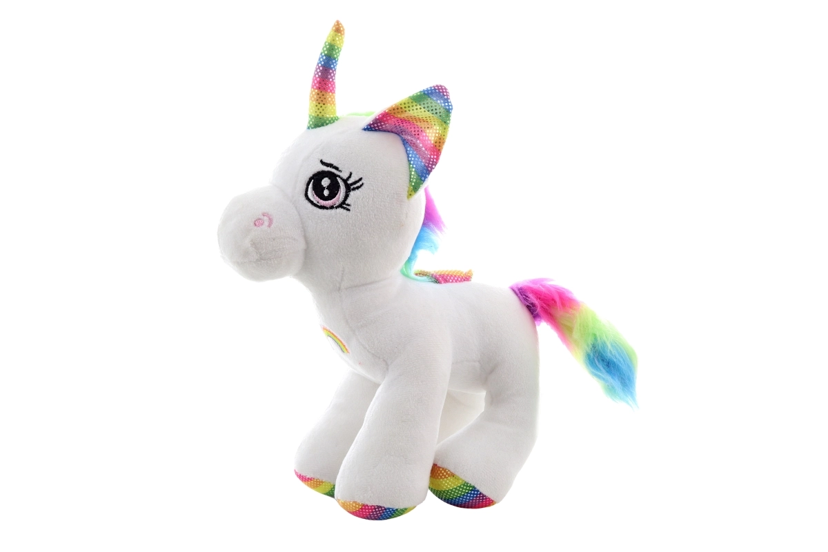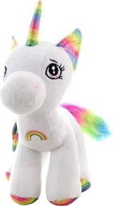 Žavus 20 cm aukščio pliushinis vienaragis iš itin minkštos medžiagos pradžiugins vaikus nuo pat gimimo. Jis turi vaivorykštinį ragą, ausytes, karčius ir uodegą, subtilias siuvinėjimo detales ir puikiai tinka glostymui bei kūrybiniams žaidimams. Dėl kompaktiškų matmenų 12 × 20 × 15 cm lengvai telpa į vežimėlį ar lovytę.