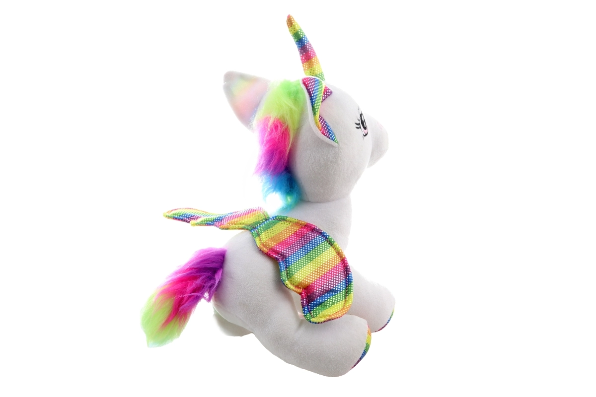 - Vaivorykštinės detalės (ragas, ausytės, kanopos, karčiai ir uodega) linksmoms spalvoms ir magiškai išvaizdai.