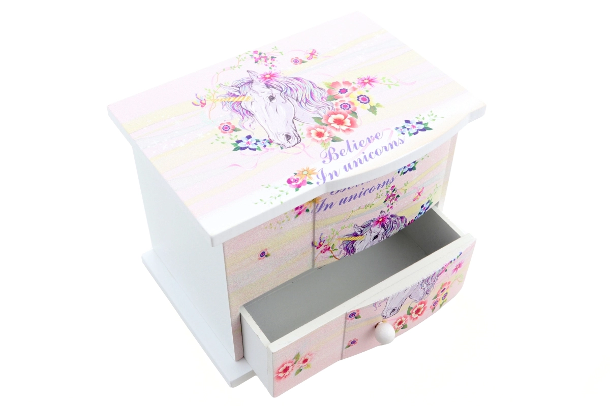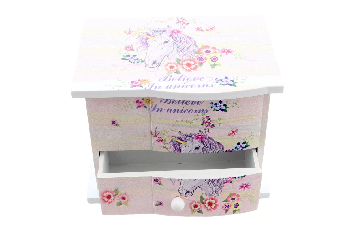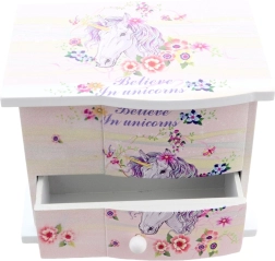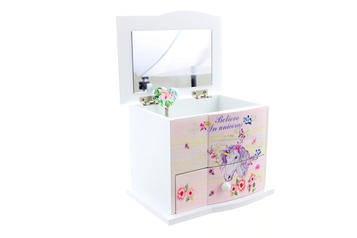 Ši žavinga medinė papuošalų dėžutė su vienaragio motyvu puikiai saugos vaikų lobius – žiedelius, apyrankes ir slaptas smulkmenas. Atidarius dangtelį ima suktis širdelė ir skamba švelni muzika, kuri kiekvieną kartą privers nusišypsoti. Viršuje slepiasi praktiškas veidrodėlis greitam papuošalų pasimatavimui, o apačioje rasite stalčiuką kitoms smulkmenoms.