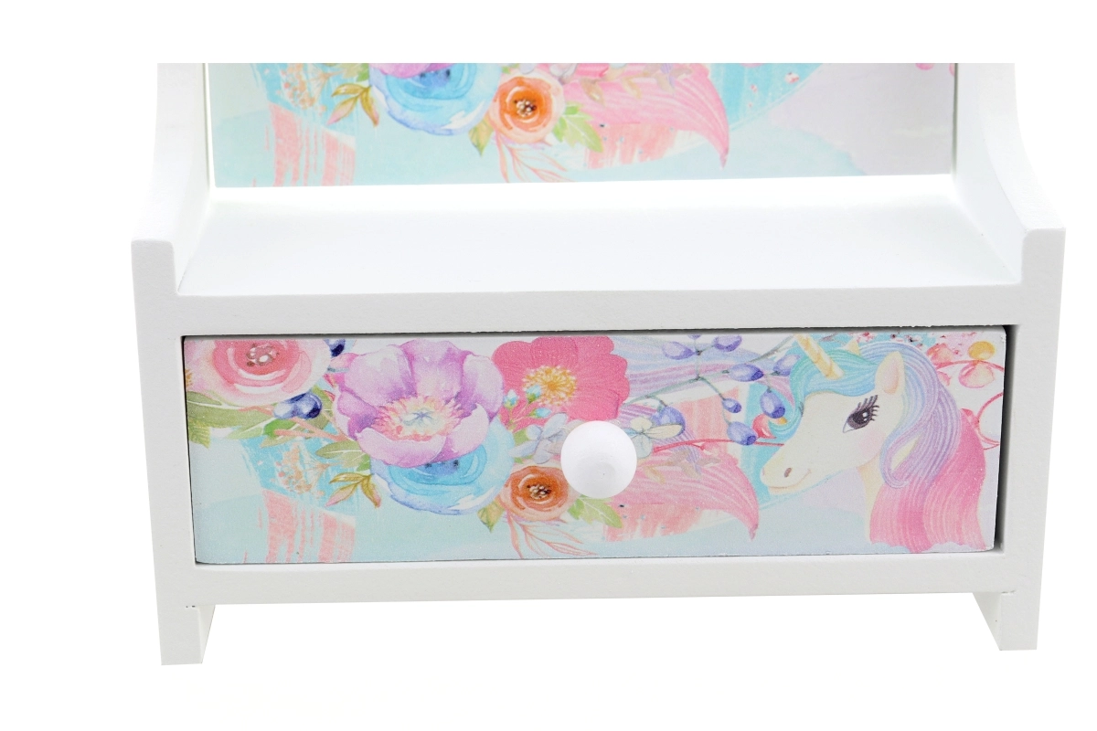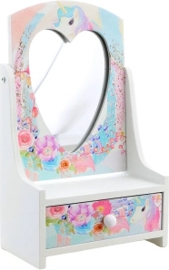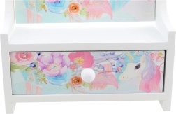Mielą medinę papuošalų dėžutę su pakreipiamu širdelės veidrodėliu vaikams patogu naudoti, kad visi lobiai būtų tvarkingai vienoje vietoje. Švelnūs pastelinių spalvų gėlių ir vienaragio motyvai paverčia ją gražia vaikų kambario dekoracija ir praktišku pagalbininku kasdieniam šukavimuisi bei žaidimams.