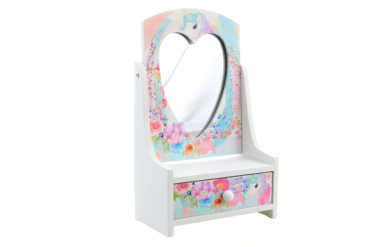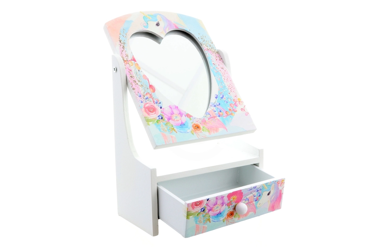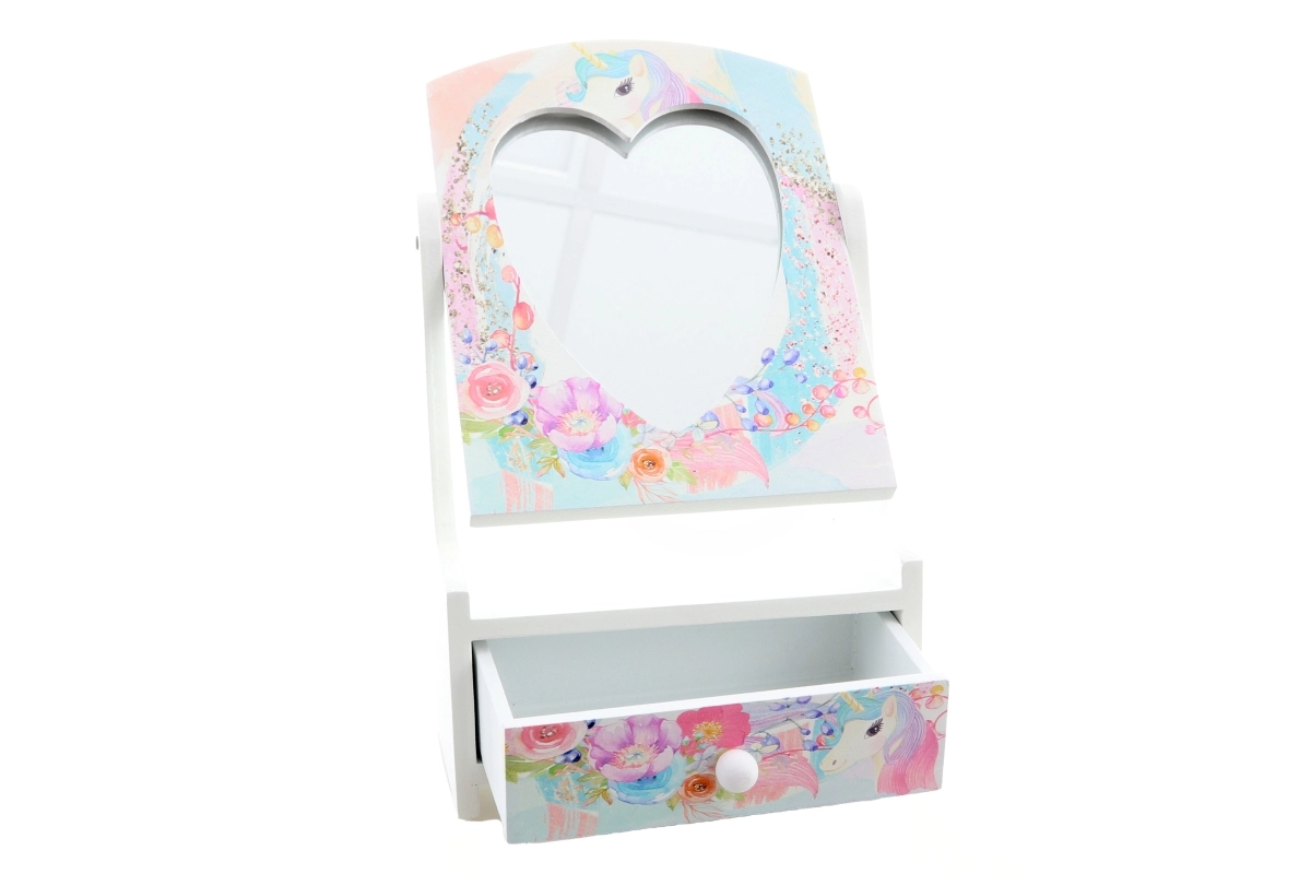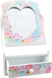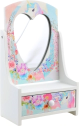 Pakreipiamas širdelės formos veidrodėlis palengvina šukavimąsi ir aksesuarų matavimą, o dėžutei suteikia pasakišką išvaizdą.