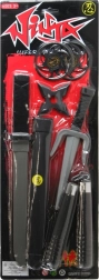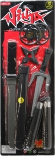 Rinkinio sudėtis: samurajų kardas su dėklu, kurio ilgis apie 36 cm, durklas, nunchakai ir 3 šurikenai (žvaigždutės). Puikus pasirinkimas karnavalui, persirengimams arba namų veiksmo istorijoms.