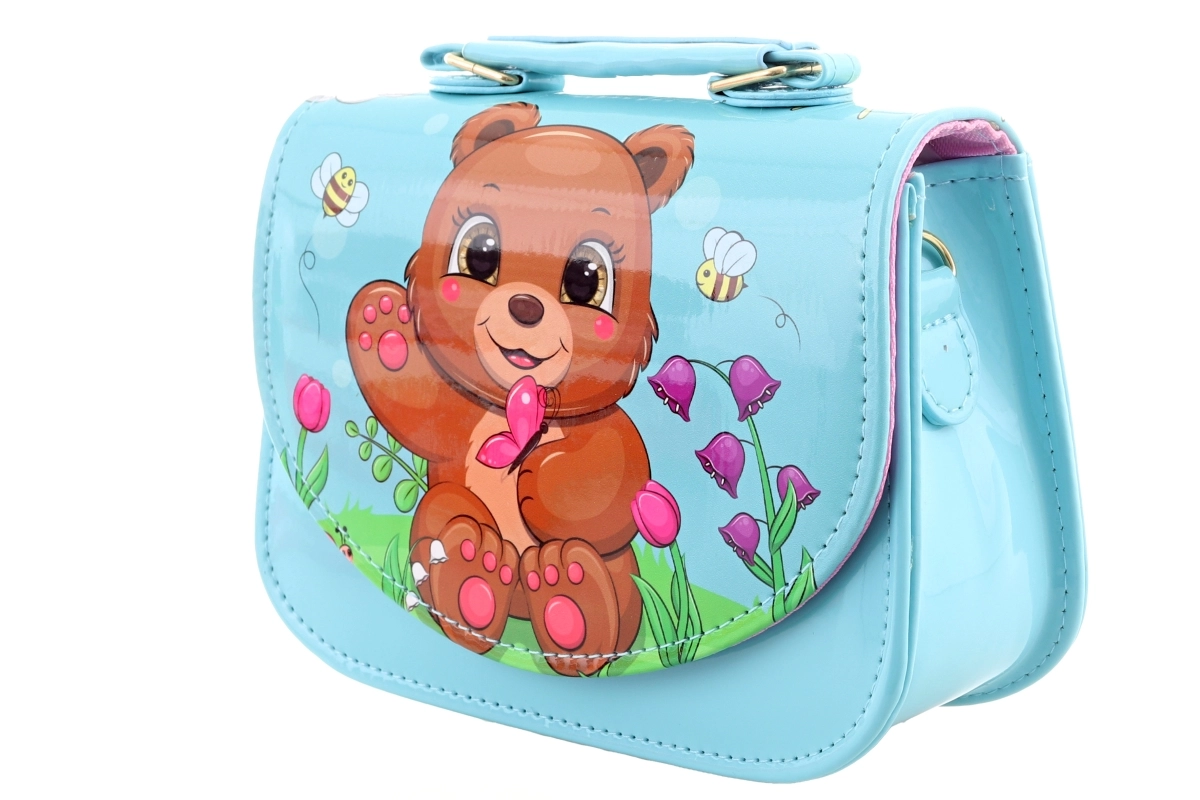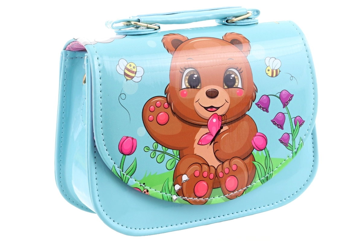Ši vaikiška rankinė su žaviu meškučiu ir gėlių motyvais taps mėgstamu aksesuaru pasivaikščiojimams, svečiavimuisi ar šventėms. Dėl blizgaus, lygaus paviršiaus ją lengva prižiūrėti, o išvaizda išlieka lyg nauja. Užsegimas spaude užtikrina greitą ir saugų uždarymą.