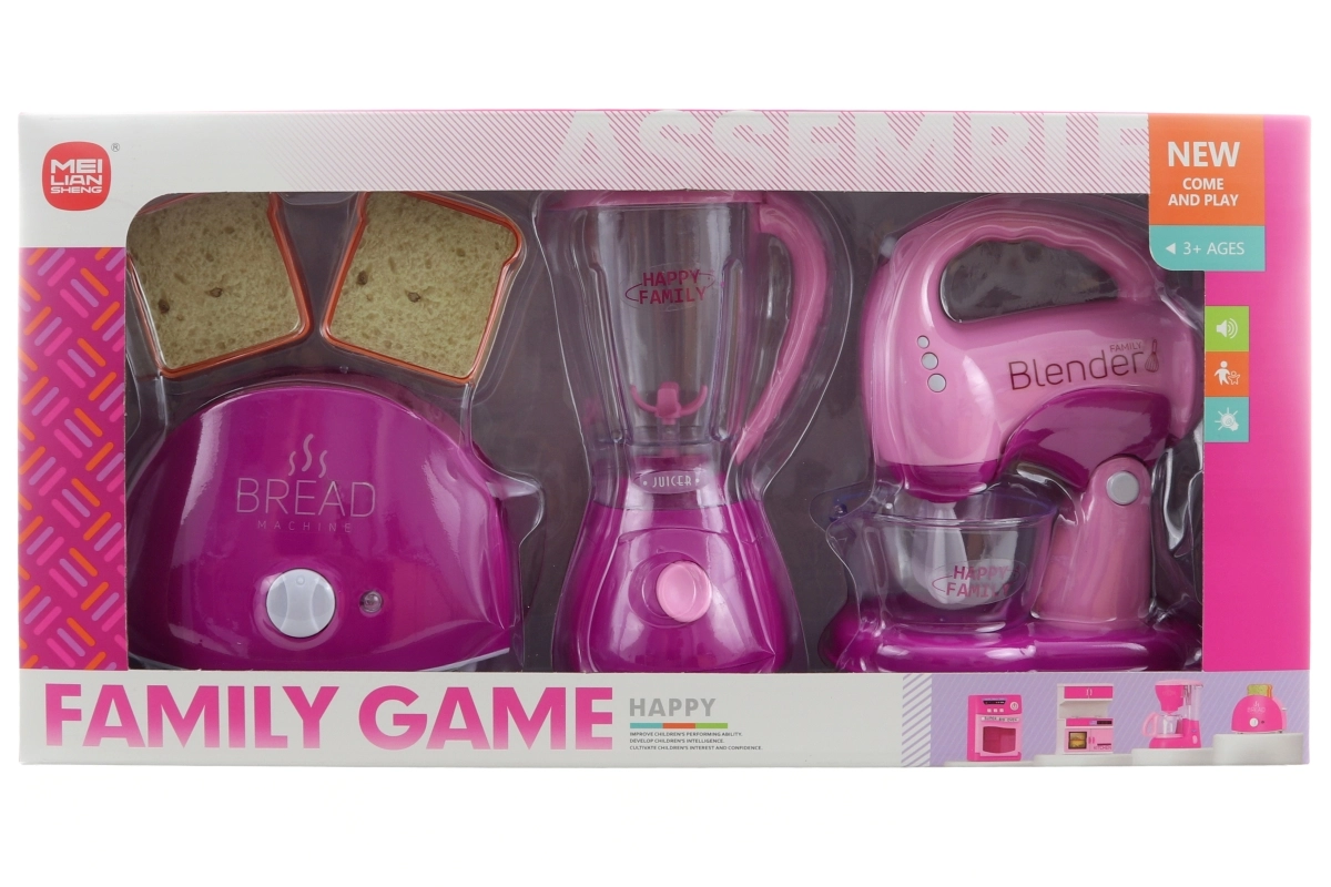 Šis spalvingas buitinių prietaisų rinkinys suteikia vaikams autentišką gaminimo patirtį. Įjungtas skrudintuvas šviečia, skleidžia garsus ir po akimirkos iššauna skrebučius. Maišytuvas turi permatomą indą, šviečia ir sukasi, o plakiklis papildomai realistiškai suka šluoteles. Viskas pritaikyta saugiam vaikų žaidimui.