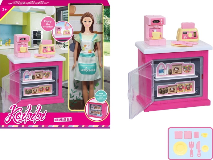 - Lėlė, virtuvės spintelė, kavos aparatas, skrudintuvas ir kiti priedai