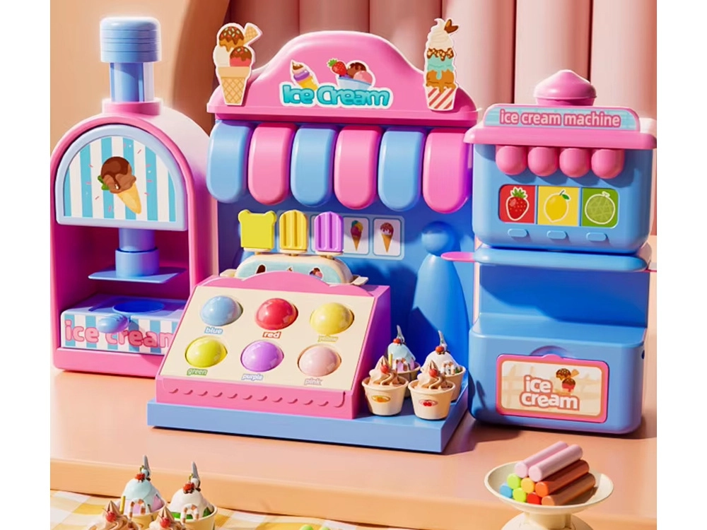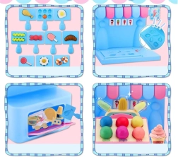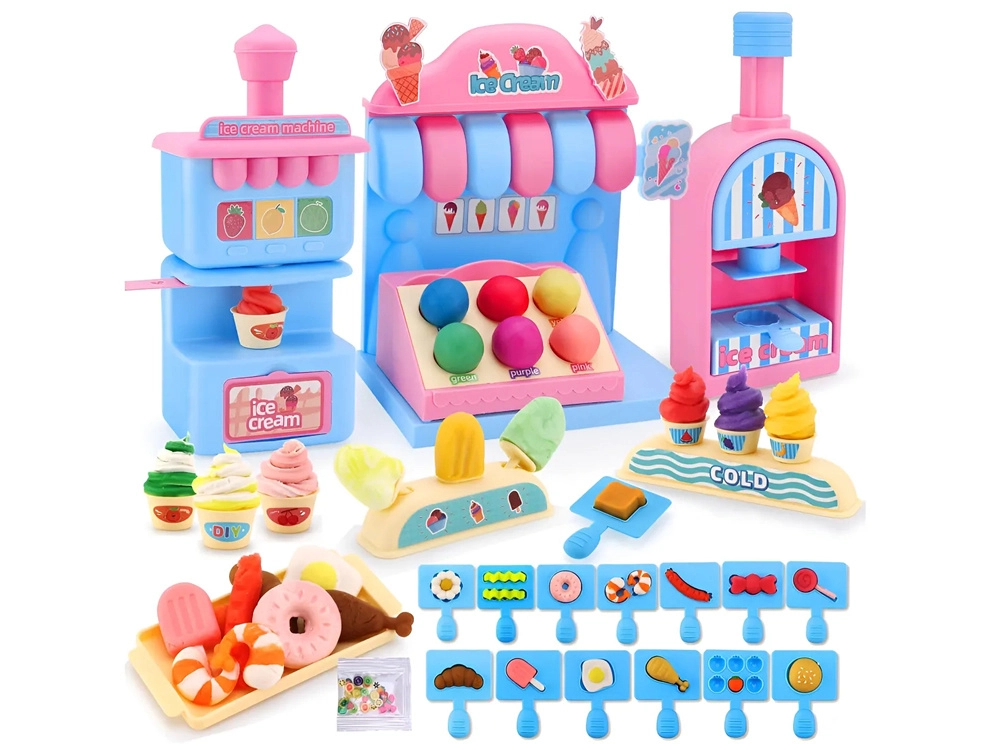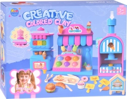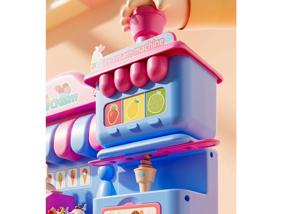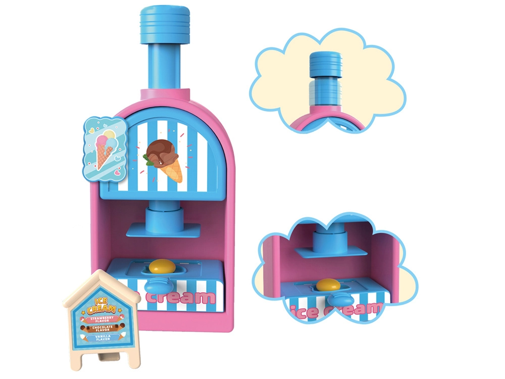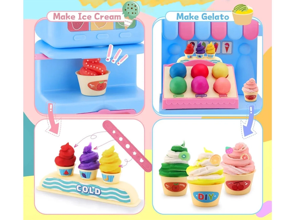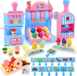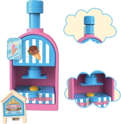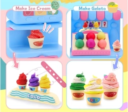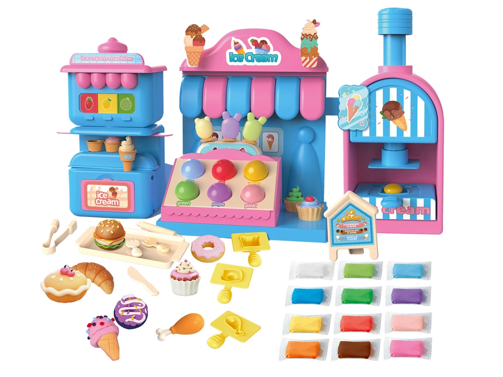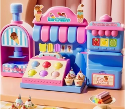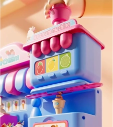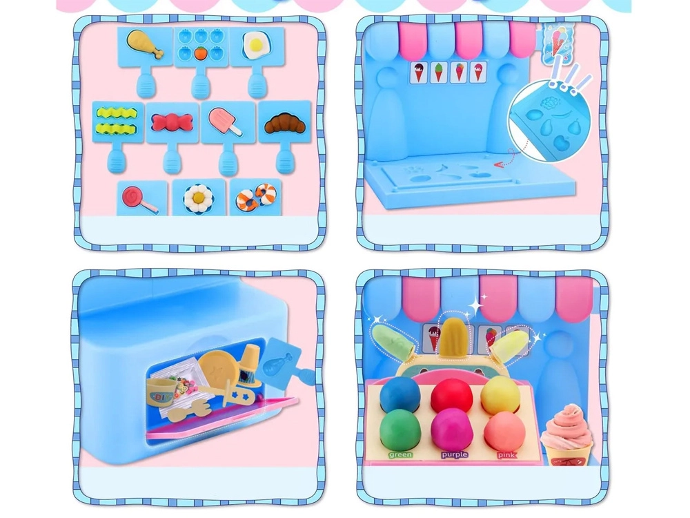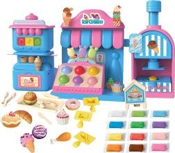 Išsamus žaidimų rinkinys apima ledų aparatą spalvingoms porcijoms spausti, prekybos pultą skanėstams eksponuoti ir presą su „kepimo“ forma keksiukams ir sausainiams formuoti. Visa tai suderinta švelniais rožinės ir mėlynos atspalviais, kad kūriniai atrodytų lyg tikroje konditerijos vitrinoje.