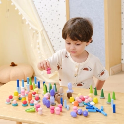 Šis montesori rinkinys siūlo laisvą, taisyklėmis nevaržomą žaidimą. Grybelius, koriai, akmenėlius, kūgelius, žiedelius bei figūrėles primenančias detales galima laisvai derinti, sluoksniuoti ir balansuoti. Taip vaikai lavina griebimą, rankos–akies koordinaciją, susikaupimą ir savarankišką problemų sprendimą.