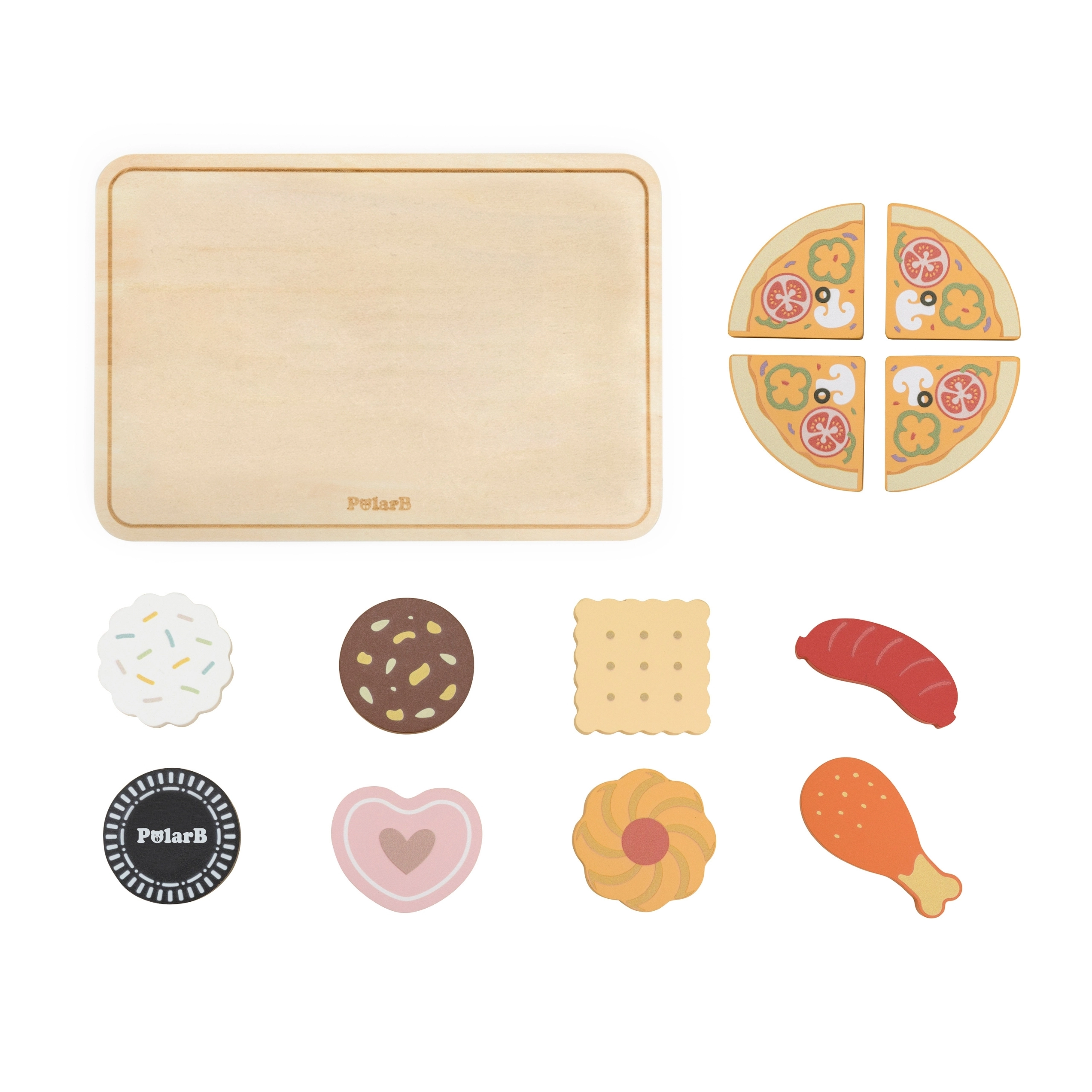 Rinkinyje yra skarda, 6 skirtingų formų sausainiai, mini pica iš 4 dalių, dešrelė ir vištos blauzdelė – viskas paruošta patiekimui.