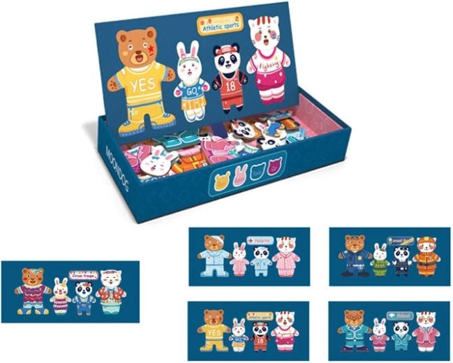 Šis magnetinis rinkinys siūlo smagų rengimą ir drabužėlių derinimą mielai meškiukų šeimai. Tvirti magnetiniai elementai leidžia vaikams lengvai keisti aprangos dalis ir išbandyti begalę derinių. Žaidimas lavina kūrybiškumą, akių–rankų koordinaciją ir loginį mąstymą.