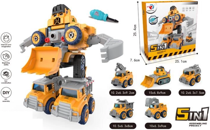 Linksmas konstruktorius vaikams nuo 3 metų: šis 5-i-1 robotas lengvai transformuojamas į įvairias darbo mašinas ir atgal. Skatina smulkiąją motoriką, kūrybiškumą ir loginį mąstymą. Rinkinyje yra vaikiškas atsuktuvas, kad būtų paprasta surinkti ir išardyti.