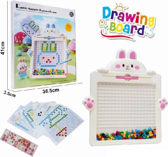 Žaidimų magnetinė lentelė triušelio formos pradžiugins vaikus nuo 3 metų. Ji leidžia lengvai piešti magnetiniu rašikliu, naudoti trafaretus ir pakartotinai trinti. Puikiai tinka smulkiajai motorikai lavinti, kūrybiškumui ir formų pažinimui.