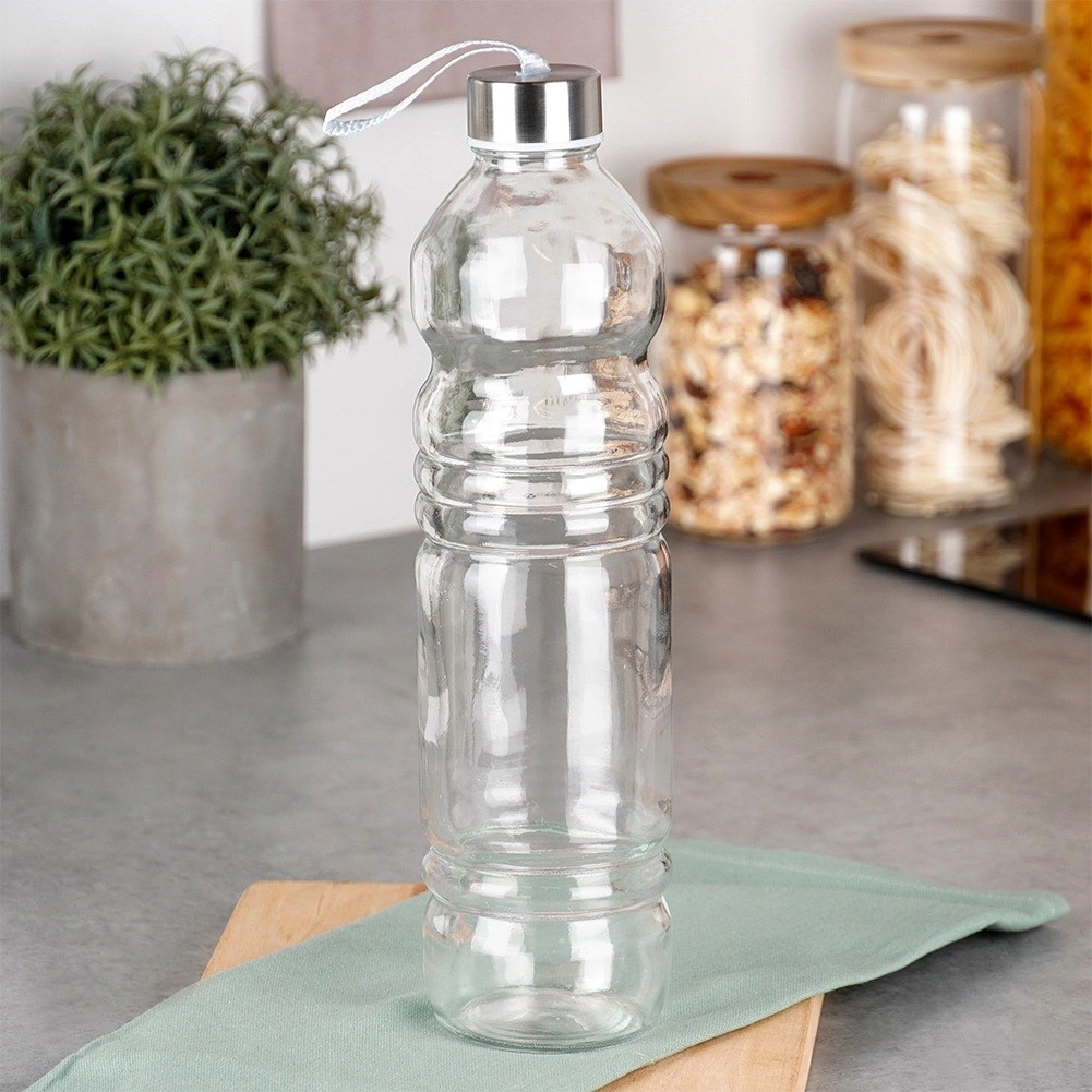 Praktiškas 1,1 l talpos stiklinis butelis su metaliniu prisukamu dangteliu ir silikoniniu sandarikliu užtikrina 100% sandarumą. Idealiai tinka vandeniui, sultims, limonadams ir glotnučiams, patogus laikyti ir lengvai prižiūrimas. Tinka kelionėms, sportui ir kasdieniam gėrimo režimui, saugiai plaunamas indaplovėje ir skirtas skysčiams iki +60 °C.