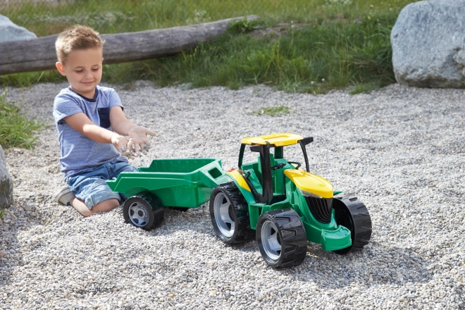 Tvirtas vaikiškas traktorius su 90 cm ilgio priekaba, žalios spalvos, žaidimams lauke ir namuose. Siūlo stumdomą stogo langą, pagamintas iš kokybiško plastiko, atlaiko statinę apkrovą iki 100 kg ir tinka vaikams nuo 3 metų.