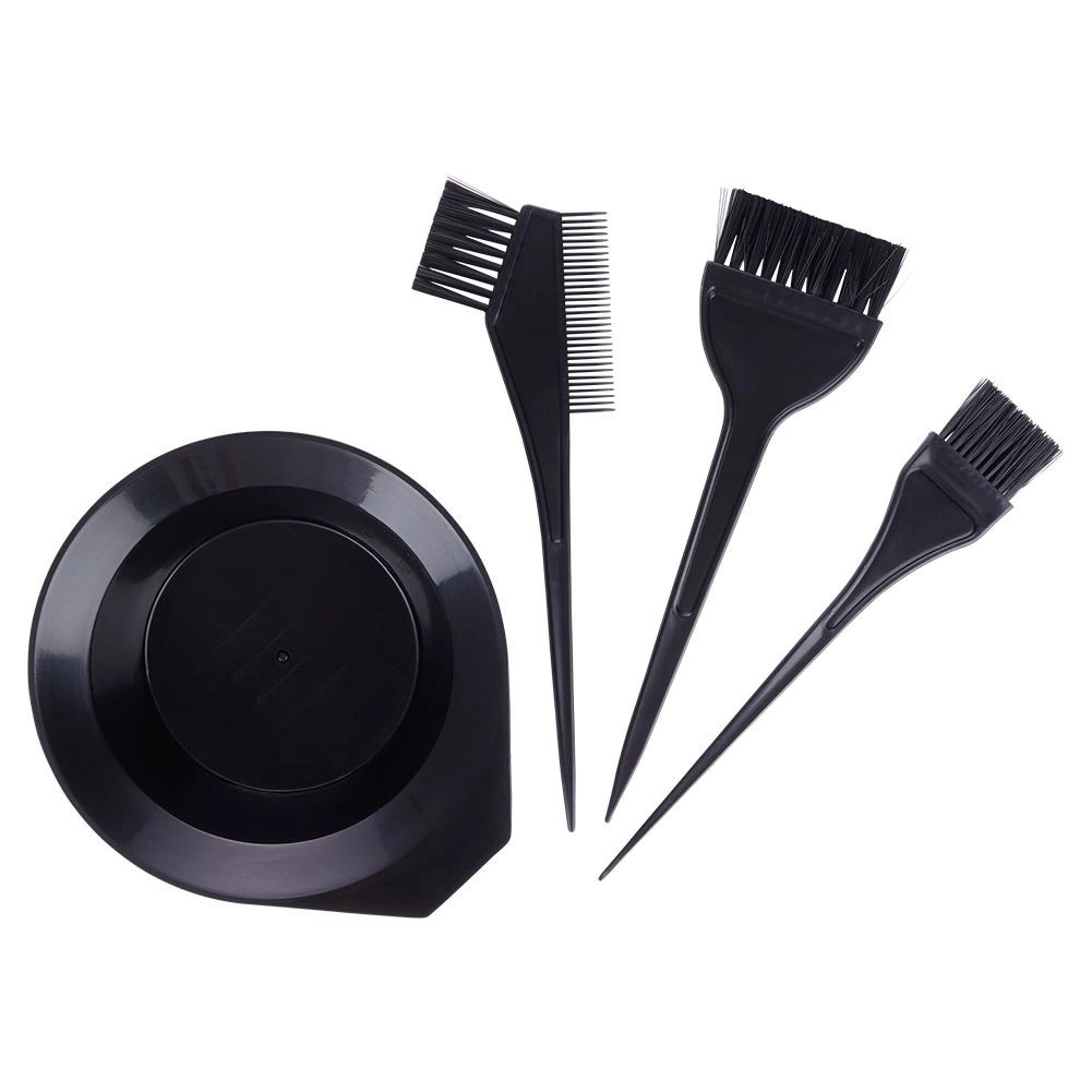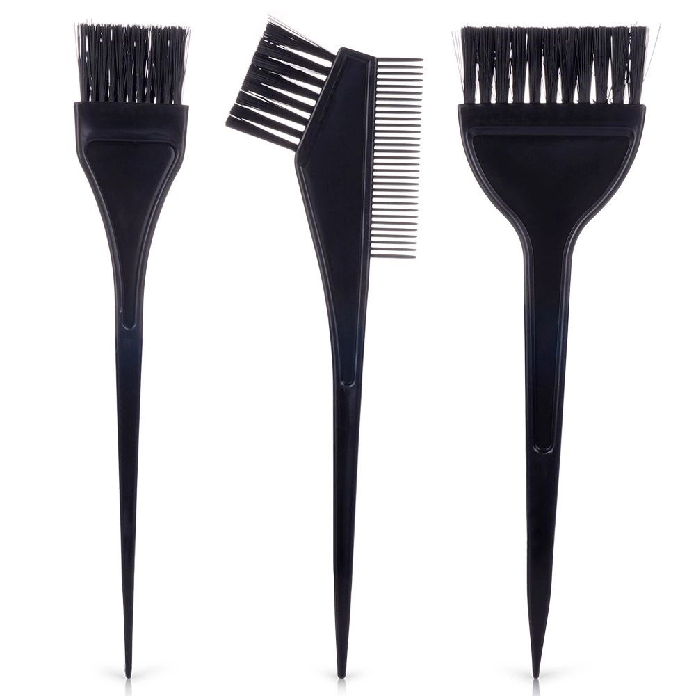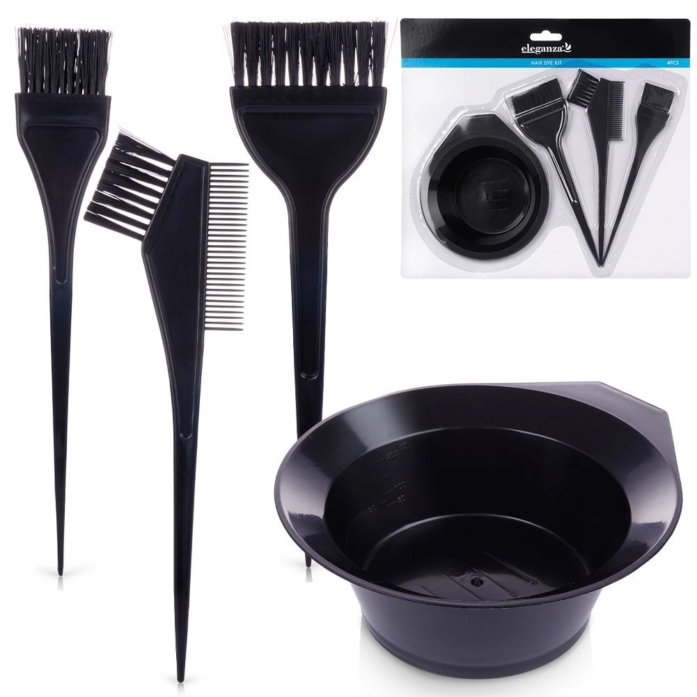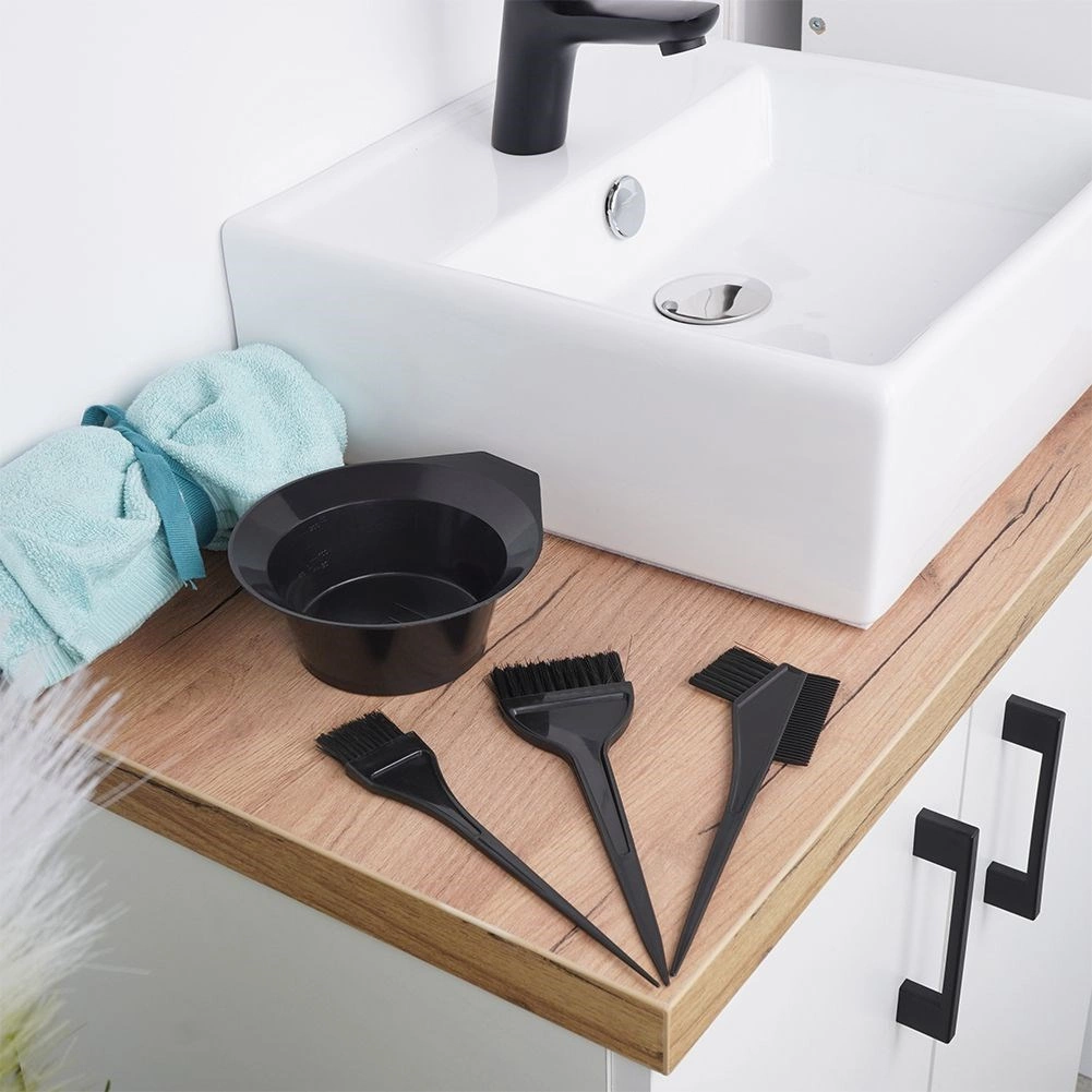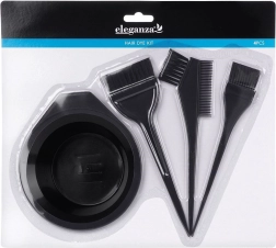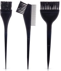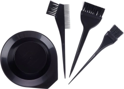 Pilnas plaukų dažymo rinkinys namų ir profesionaliam naudojimui: miserė su matuokle ir trys aplikavimo teptukai, įskaitant teptuką su šukomis. Patvarus plastikas, atsparus chemijai, smailios rankenėlės tiksliam sruogų atskyrimui ir daugkartinis naudojimas dėl lengvos priežiūros.