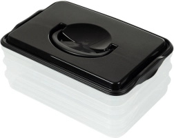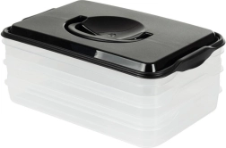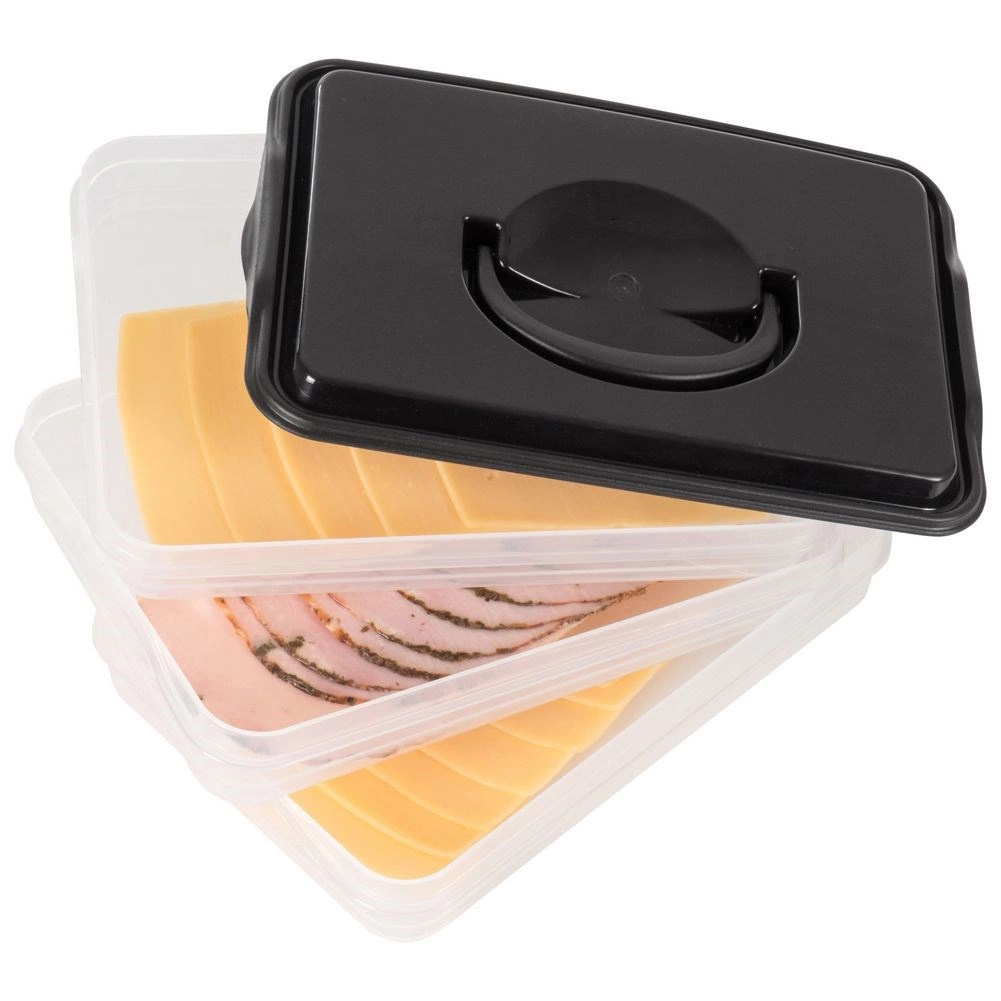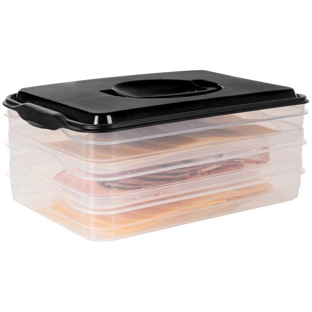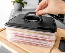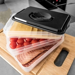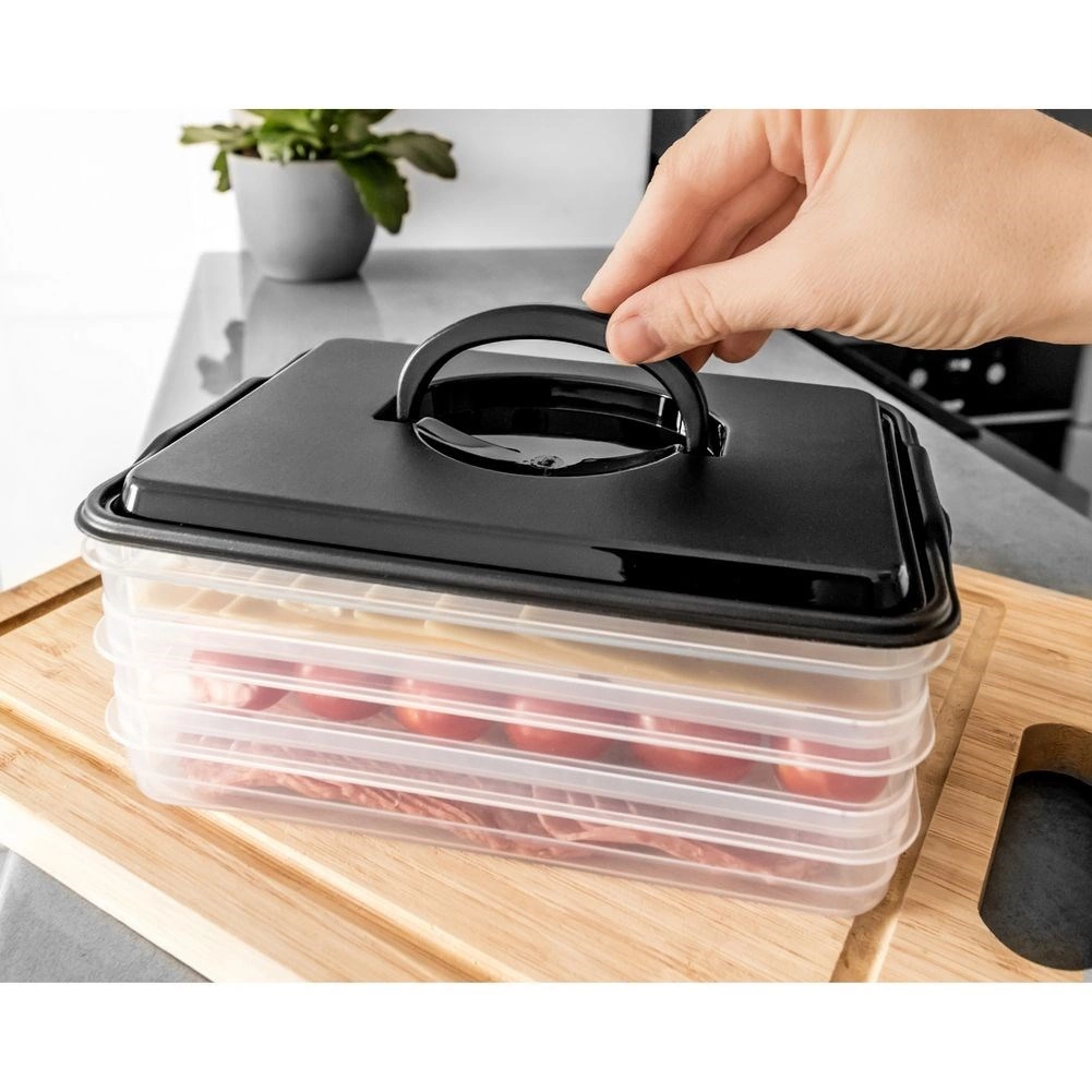 Šis išmanus maisto organizatorius siūlo tris atskiriamas, skaidrias pakopas patogiam pjaustytų sūrių, mėsos gaminių ir smulkių ingredientų laikymui, neleidžiant maišytis kvapams. Kompaktiška stačiakampė forma puikiai tinka šaldytuvo lentynoms, o tvirtas juodas dangtis su rankenėle užtikrina lengvą naudojimą.