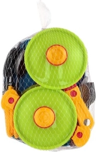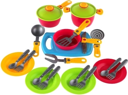 Žaiskite virėjus su šiuo linksmu vaikiškų indų rinkiniu su pjaustymo lentele. Jame yra viskas, ko reikia mažiesiems virėjams ir virėjėlėms, o rinkinys pagamintas iš kokybiško ir sveikatai saugaus plastiko, kuris yra atsparus mechaniniams pažeidimams. Puikiai tinka vaizduotei ir smulkiajai motorikai lavinti nuo 3 metų.