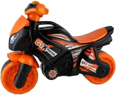 Vaikiškas balansinis motociklas sportiško dizaino pradžiugins visus mažus greičio mėgėjus. Dėl patvarios plastikinės konstrukcijos jis puikiai tinka smagiam ir saugiam žaidimui. Dizainas daugiausia oranžinis-juodas su GTX Racing logotipais, suteikiančiais tikro lenktyninio motociklo pojūtį.