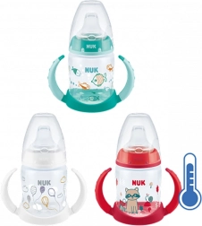NUK mokomasis buteliukas padeda 6–18 mėn. vaikams žengti pirmuosius savarankiško gėrimo žingsnius. Integruotas temperatūros indikatorius pamėlynuoja/pabąla priklausomai nuo gėrimo temperatūros, todėl galite būti tikri, kad skystis nėra per karštas. Minkštas silikoninis snapelis yra švelnus jautrioms dantenoms ir tuo pačiu nevarvantis, tad sumažina nepageidaujamą išsipylimą namuose ir kelionėse.