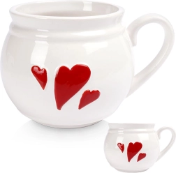Didelis keraminis puodelis 800 ml su reljefinėmis raudonomis širdelėmis idealiai tinka arbatai, kavai, kakavai ir karštam vynui. Jis turi patogią rankenėlę, lengvai valomas indaplovėje ir tinka mikrobangų krosnelei. Klasikinė „ąsočio“ forma patogiai gula į ranką ir papuoš bet kurį stalą.