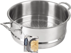 Dėl perforuoto dugno garai cirkuliuoja tolygiai, o aplinkui esantis profiliuotas žiedas užtikrina stabilų padėjimą ant puodo ir sumažina garų nuotėkį. Kniedėmis tvirtinamos rankenos palengvina saugų naudojimą. Įdėklas suderinamas su 24 cm skersmens puodais ir lengvai plaunamas indaplovėje.