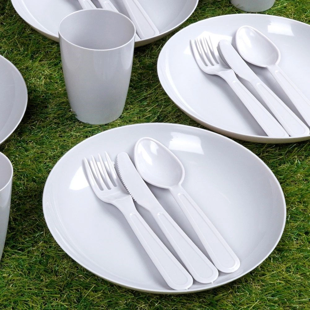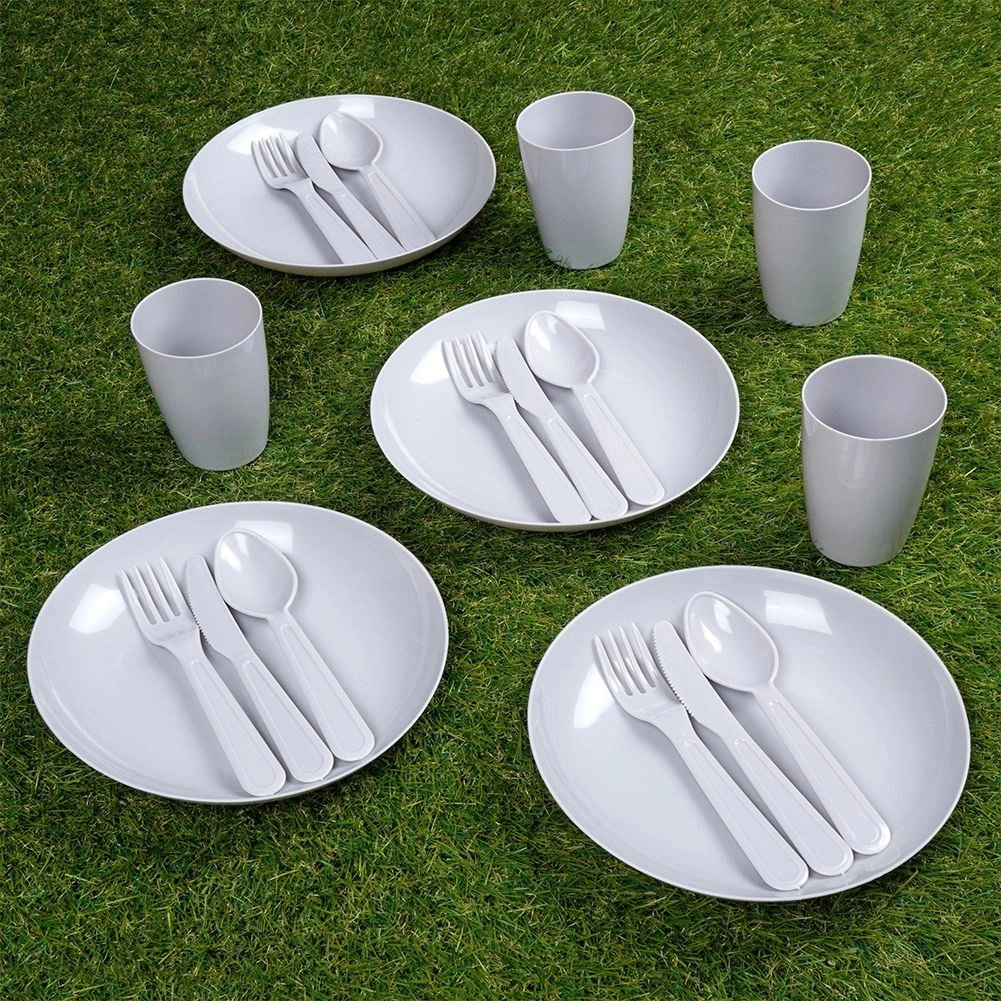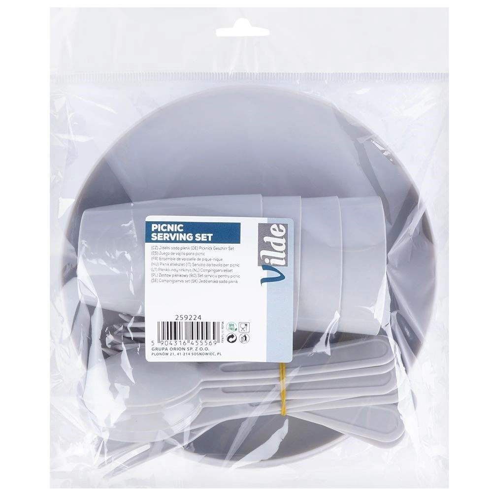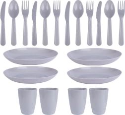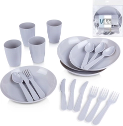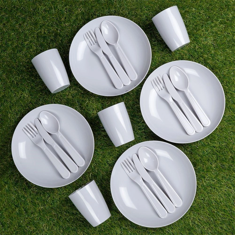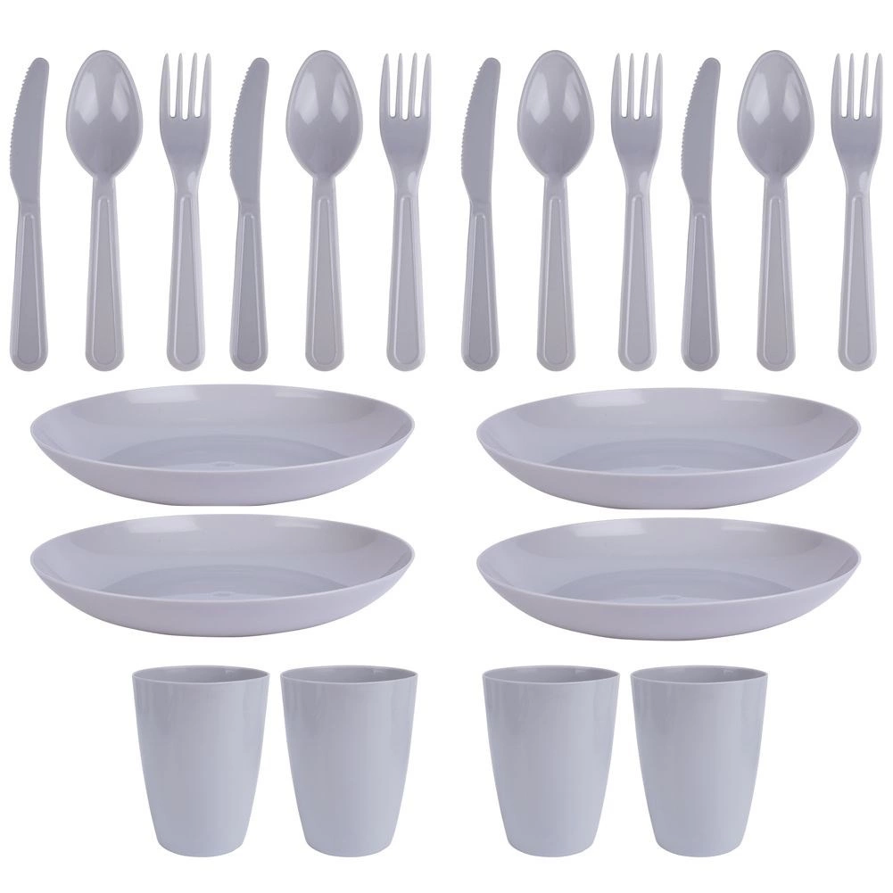 Pilnas plastikinis iškylų rinkinys 4 asmenims, iš viso 20 dalių, idealiai tinka išvykoms, sodui ir stovyklavimui. Sudėtyje yra keturi puodeliai, lėkštės ir stalo įrankiai. Jis yra lengvas, patvarus, be BPA ir daugkartinio naudojimo – puiki alternatyva vienkartiniams gaminiams.