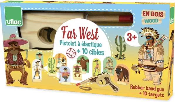 Medinis vesterniškas pistoletas su taikiniais VILAC suteikia saugią ir linksmą varžymosi formą. Vaikai žaisdami lavina rankos ir akies koordinaciją, mokosi susikaupti ir ugdo kantrybę. Paprastas gumytės mechanizmas lengvai valdomas ir tinkamas mažiesiems.